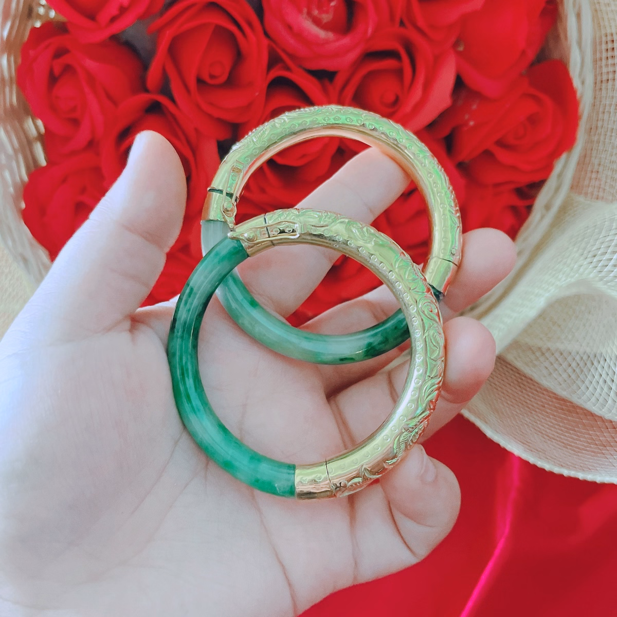 Tên sản phẩm: [ 1 cái ] vòng tay ngọc cẩm thạch thiên nhiên bọc bạc ta xi vàng – thắng giang