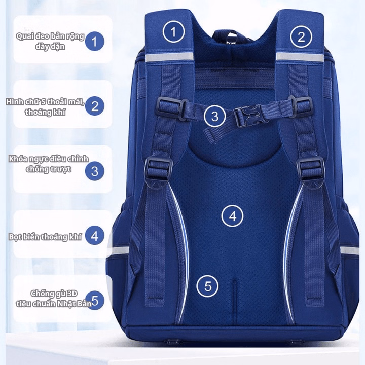 Mặt sau của cặp được làm từ chất liệu lưới thoáng khí cao cấp mang lại sự thoải mái và làm êm cột sống.