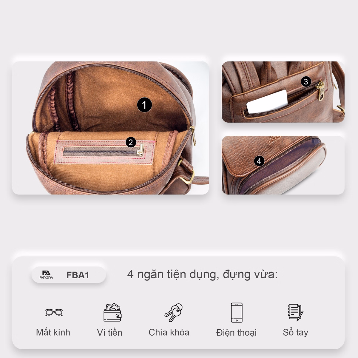 Balo da Fadoda Fba1 được thiết kế gọn gàng, với số lượng ngăn được tối ưu một cách tiện dụng. Cho phép bạn gói ghém tất cả vật dụng cần thiết cho cả một ngày dài. Với dây đeo da mềm mại, đem lại cảm giác thoải mái hoàn toàn cho bạn. Ngoài ra Đường chỉ may được gia công tỉ mỉ từ những người thợ lành nghề. Khóa kéo được làm từ hợp kim cao cấp. Sự kết hợp này mang đến cho bạn chiếc balo đẹp và bền bỉ theo năm tháng.