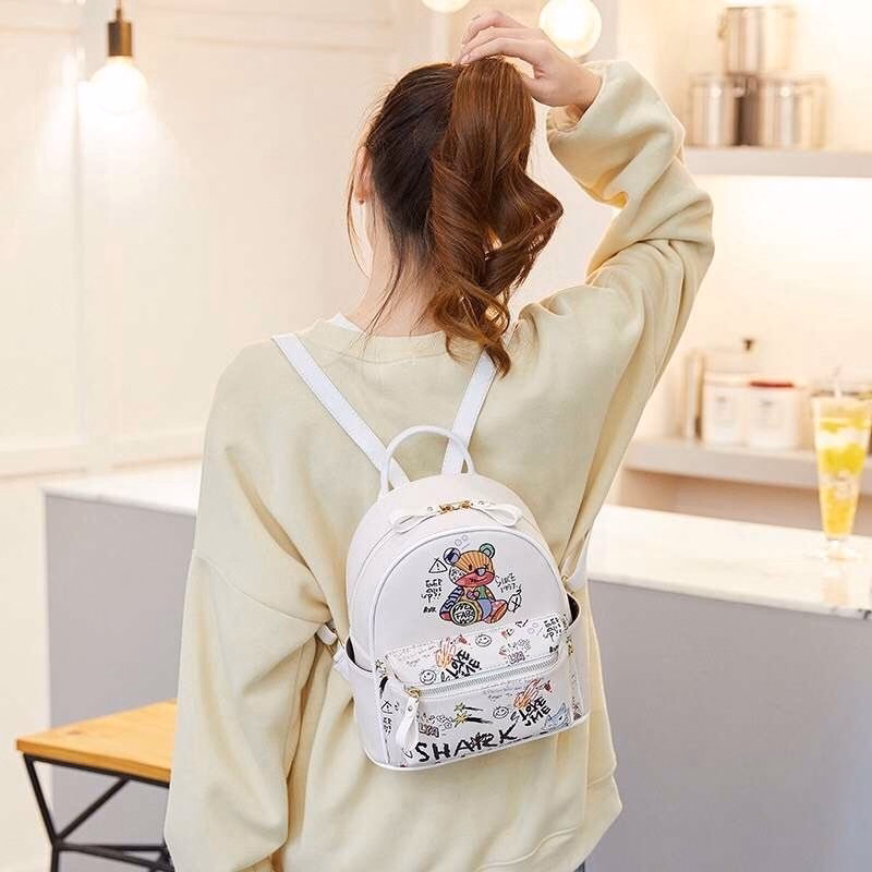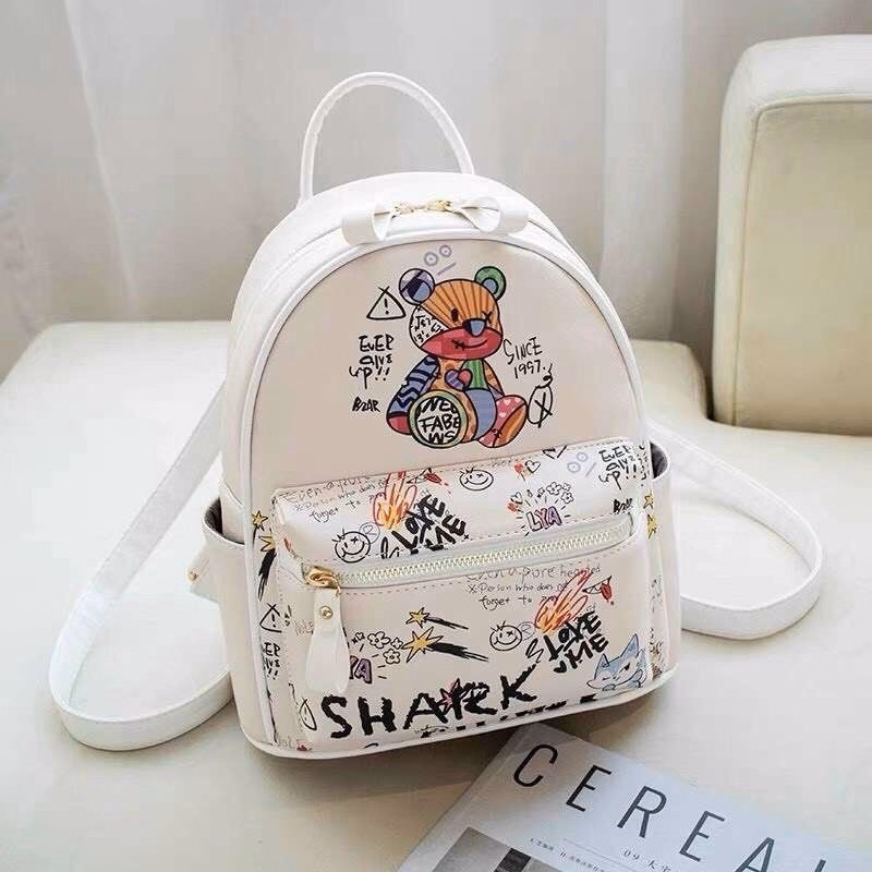 Balo họa tiết gấu kết hợp in hoạt hình khác xen kẽ với gam màu sắc tươi tắn, dễ thương.