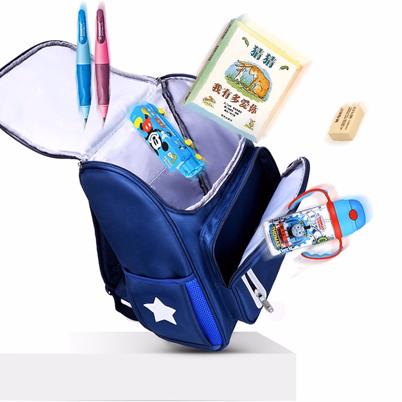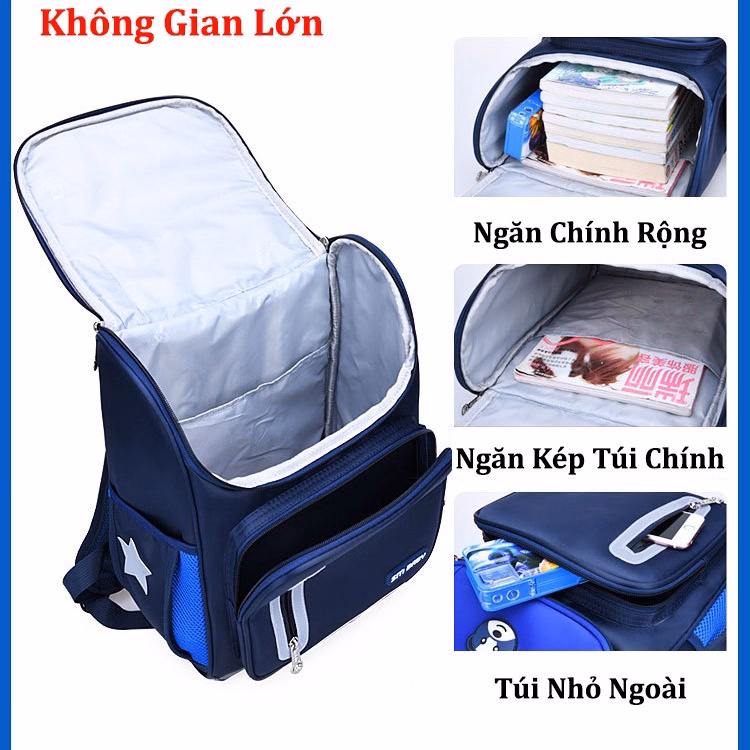 Ngăn chứa đồ rộng rãi, có chỗ để cài bút và dụng cụ học tập. Ngăn phụ phía trước và hai bên. Quai và lưng được đệm mút cao cấp, làm giảm áp lực lên cột sống của bé. Chất liệu chống nước.