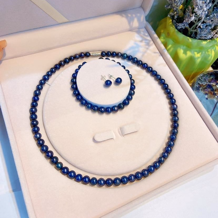 Bộ Trang Sức Ngọc Trai Nuôi Nước Ngọt Đen Ánh Tím 8 Ly – Thắng Giang