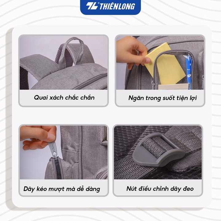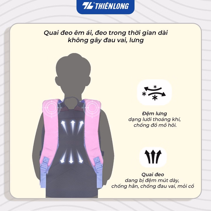 Sản phẩm Thiên Long có thiết kế mặt sau với nhiều cải tiến như: đệm mút dày dặn hơn… Kết hợp với chất liệu siêu nhẹ và bền, giúp bé thoải mái và dễ dàng di chuyển.