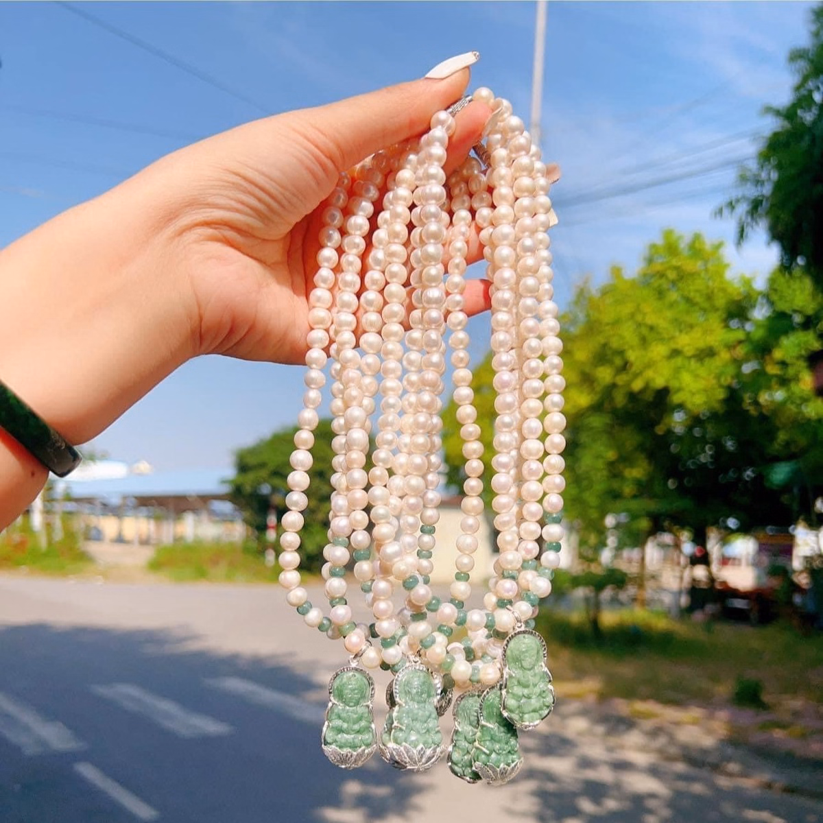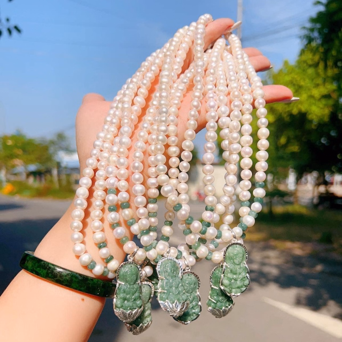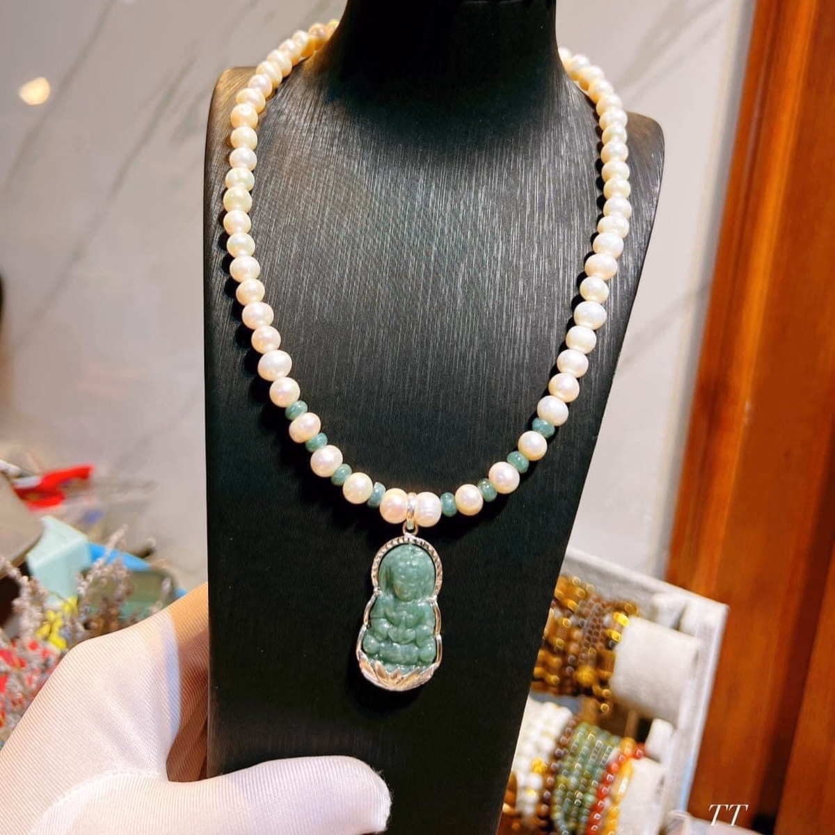 Tên sản phẩm: dây chuyền ngọc trai nuôi gắn mặt phật quan âm ngọc cẩm thạch bọc bạc ta – thắng giang