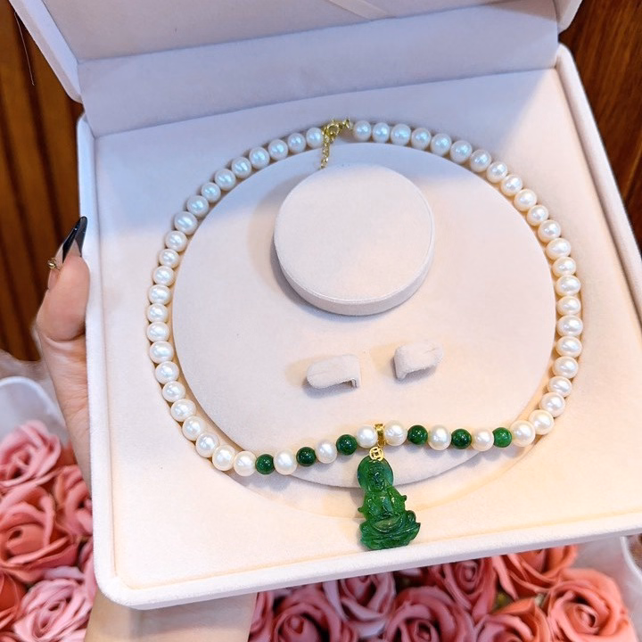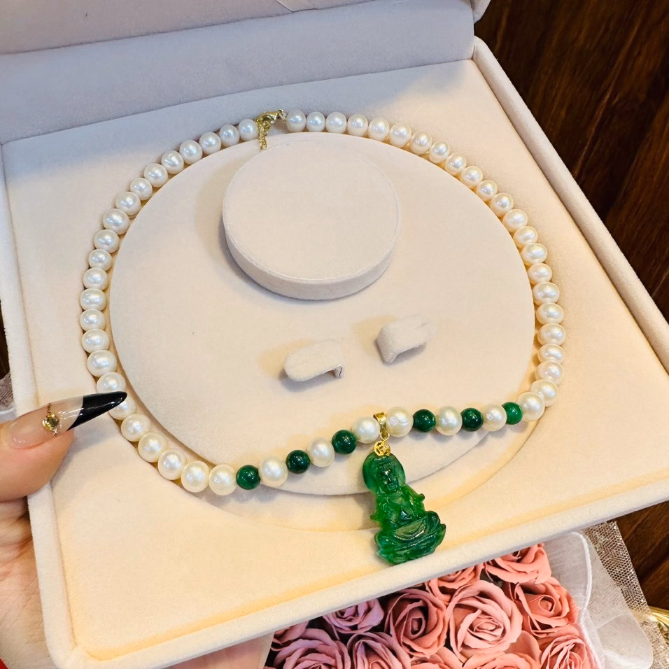 Dây Chuyền Ngọc Trai Nuôi Nước Ngọt Phối Mặt Quan Âm Ngọc Cẩm Thạch Thiên Nhiên Móc Vàng Tây 10 Kara – Thắng Giang