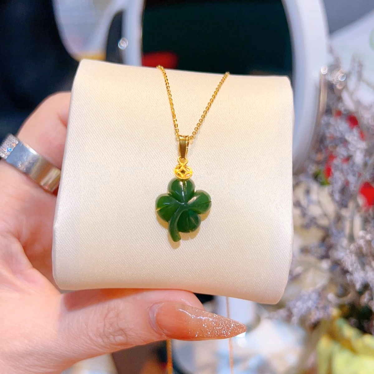 Mặt Dây Chuyền Cỏ Bốn Lá Ngọc Bích Thiên Nhiên Cao Cấp Móc Mặt Vàng Tây 10 Kara – Thắng Giang