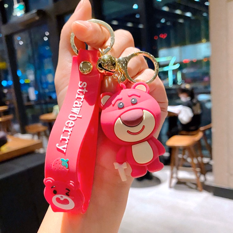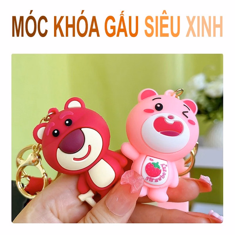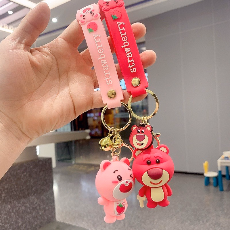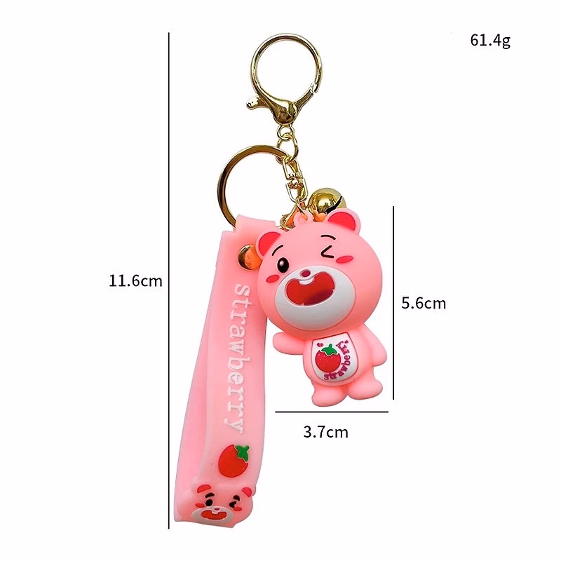 Mô tả sản phẩm Móc khoá gấu hồng, móc khóa trang trí màu hông gấu dâu lotso phong cách hàn quốc đẹp dễ thương có chuông và dây tag treo balo, cặp táp, ví, móc chìa khoá xe máy ô tô hot Trend, Móc khoá gấu dâu tây dễ thương, gấu lotso bằng nhựa dẻo