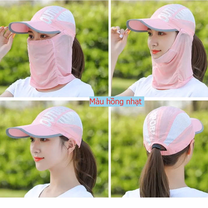 • Khẩu trang che mặt là lớp lưới mỏng thoáng khí, có thể tháo rời dễ dàng và đội như mũ lưỡi trai bình thường