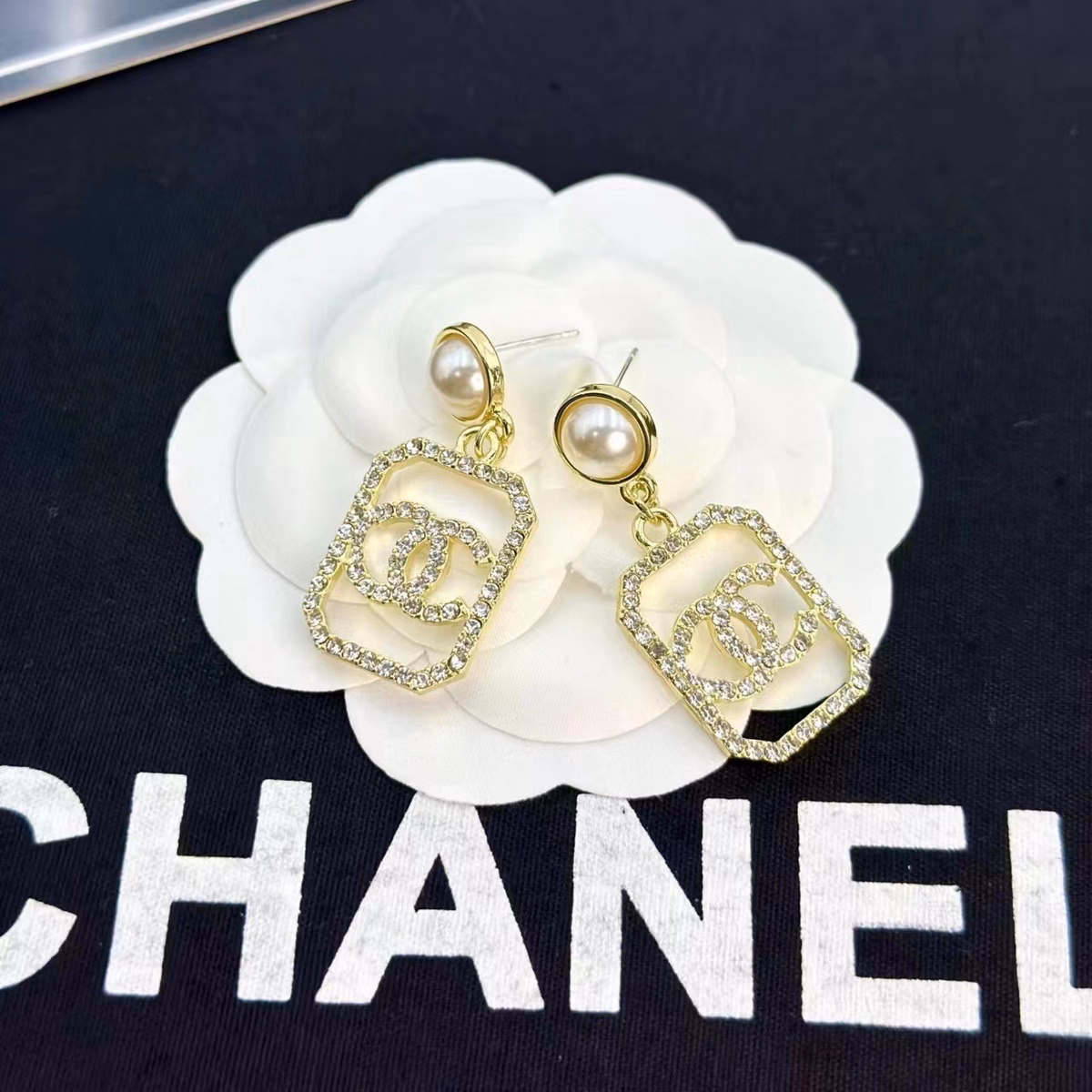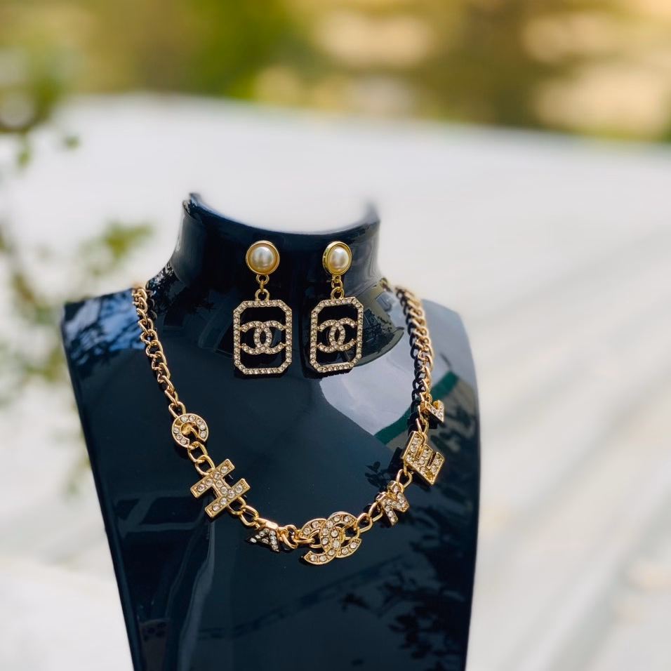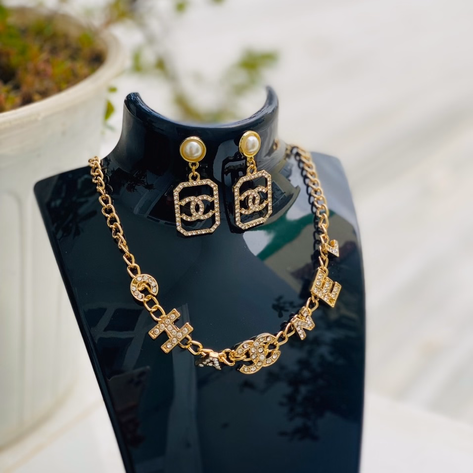 Tên sản phẩm: Set Vòng Cổ Xích Mảnh Có Logo Chữ Chanel Mix Khuyên Tai Ngọc Bo Viền Đính Đá S238 – Lady’s Passion
