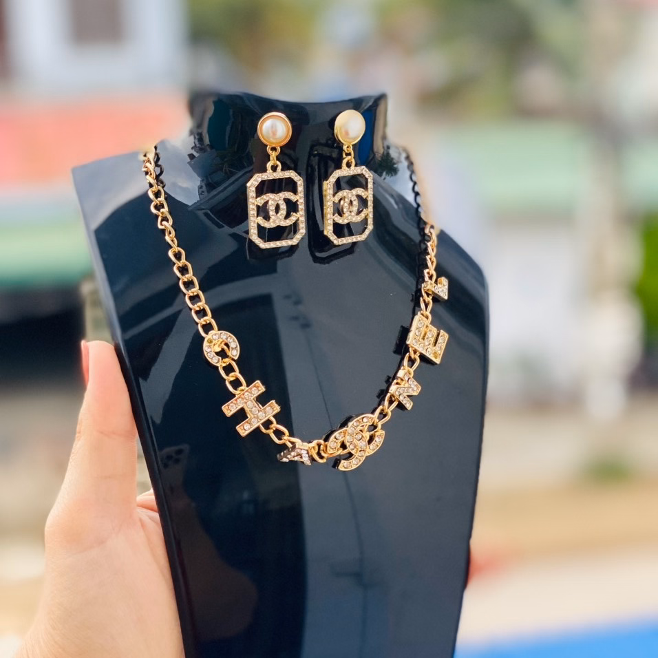 Set Vòng Cổ Xích Mảnh Có Logo Chữ Chanel Mix Khuyên Tai Ngọc Bo Viền Đính Đá S238 – Lady’S Passion