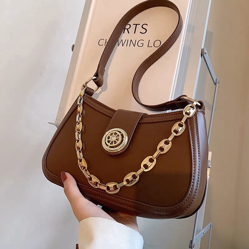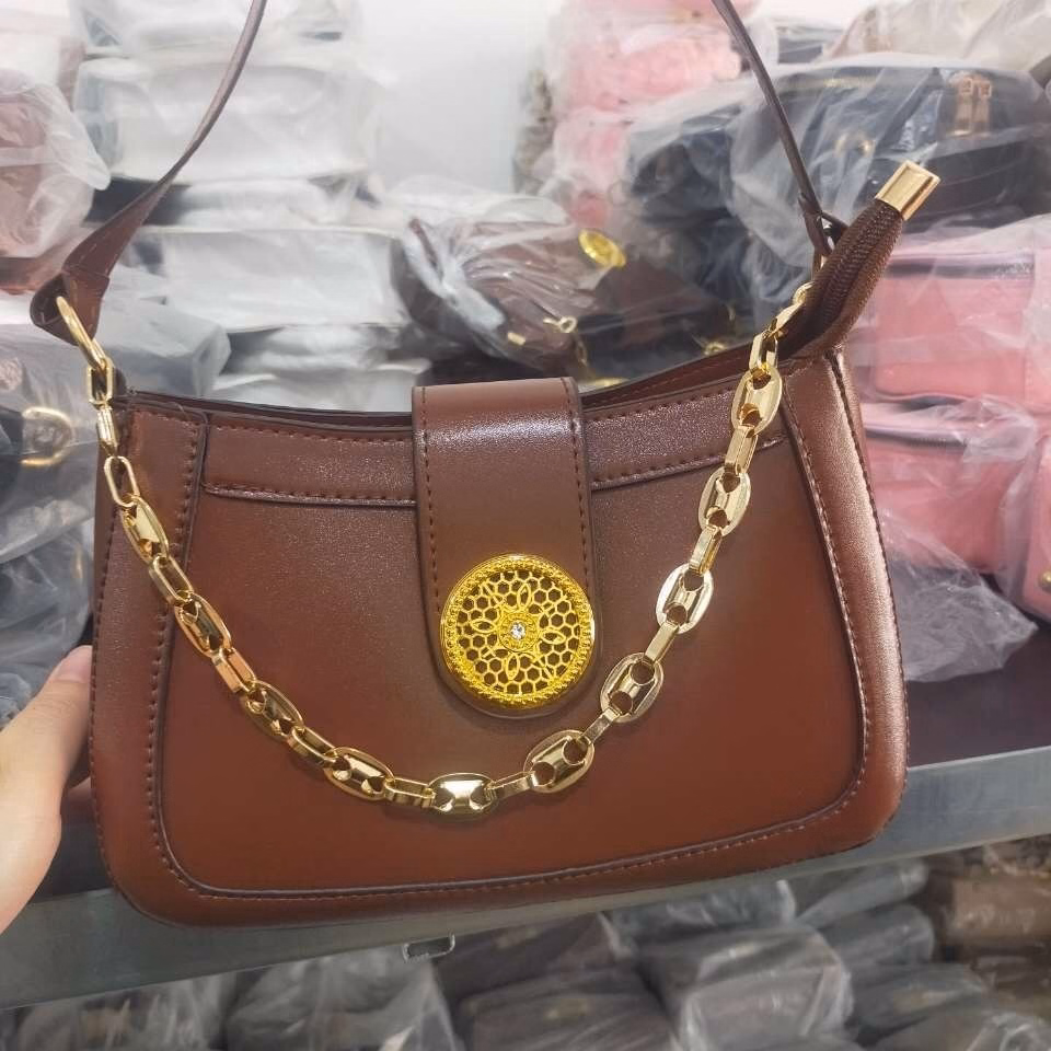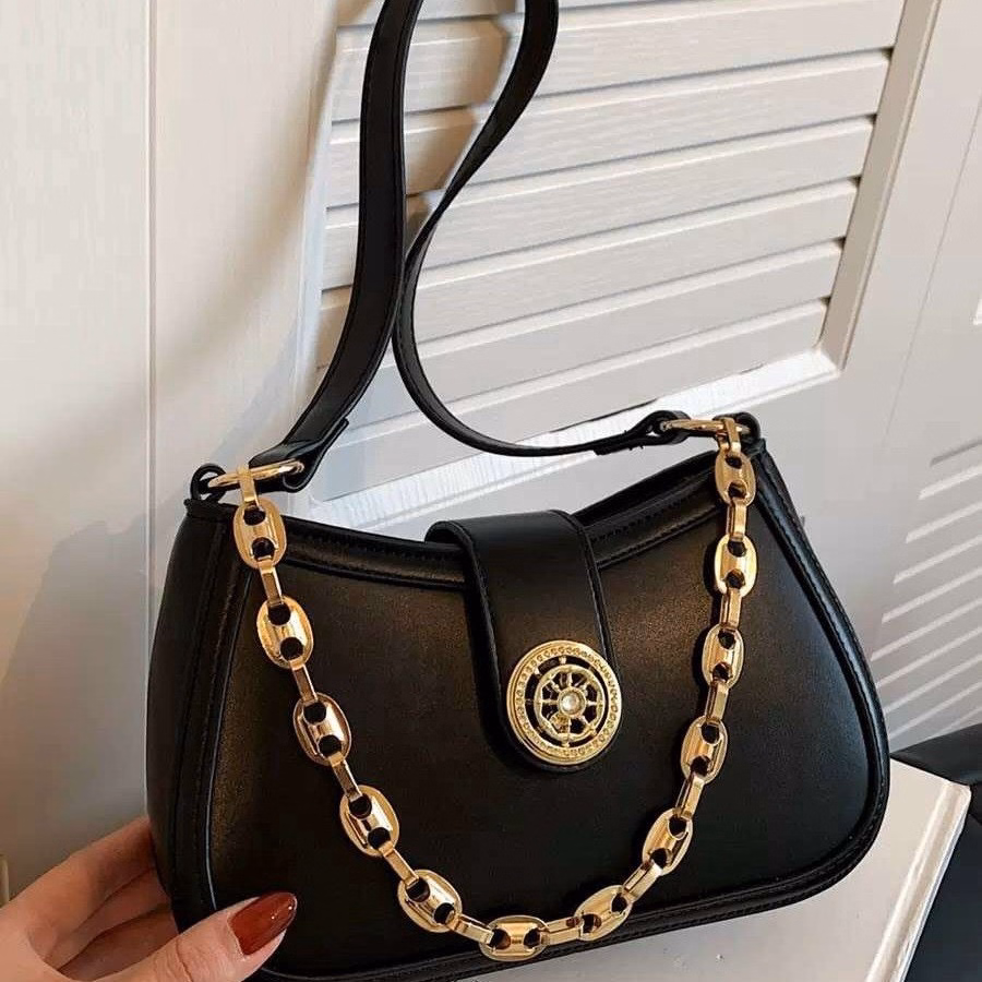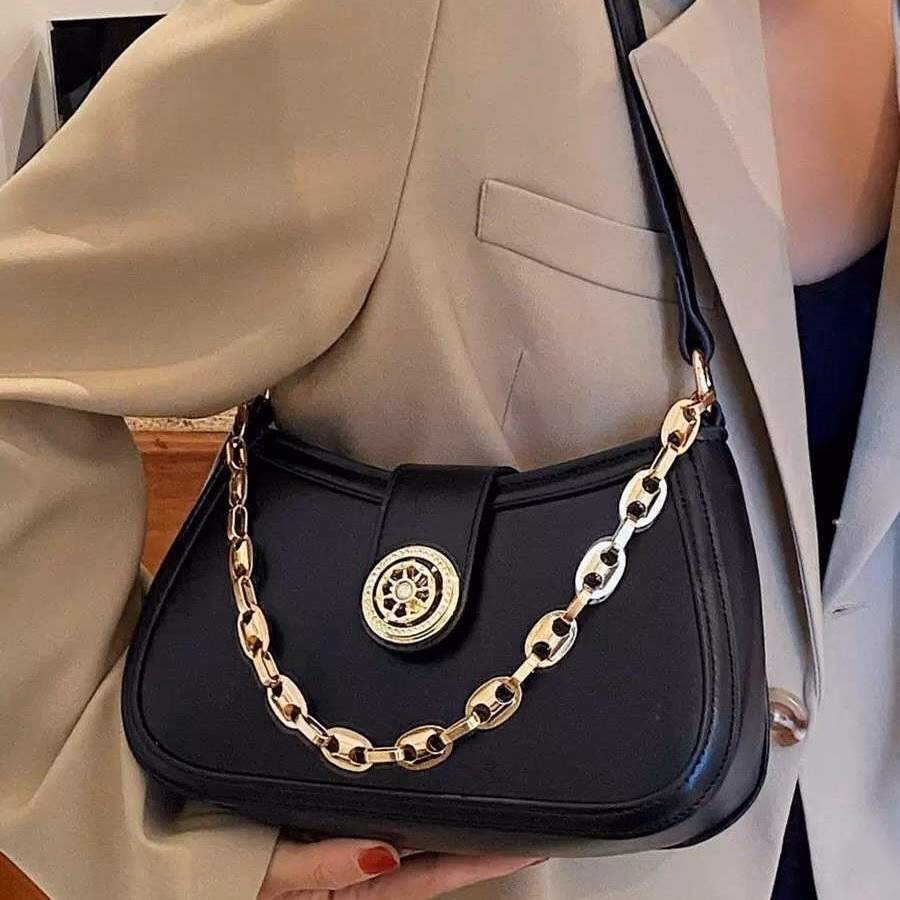 Mẫu túi xách cắp nách chỉ 1 dây đeo không điều chỉnh được ngắn dài. Với thiết kế nắp cài kết hợp vương miện tròn kèm dây xích vắt ngang thân túi làm tô điểm nổi bật cho túi. Túi có khóa kéo miệng chống rơi đồ, đáy túi được thiết kế cứng cáp với đường may chắc chắn. Với chất liệu da Pu mềm mại sờ vào là mê.