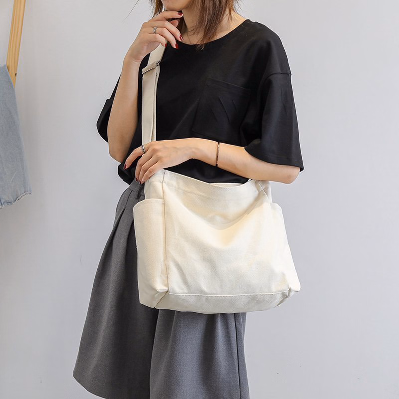 Túi đeo chéo được làm từ chất vải canvas dòng sợi tự nhiên, thân thiện môi trường. Túi có thể sử dụng đeo chéo, đeo ngang hông, trước ngực, hoặc sau lưng.