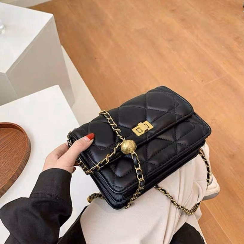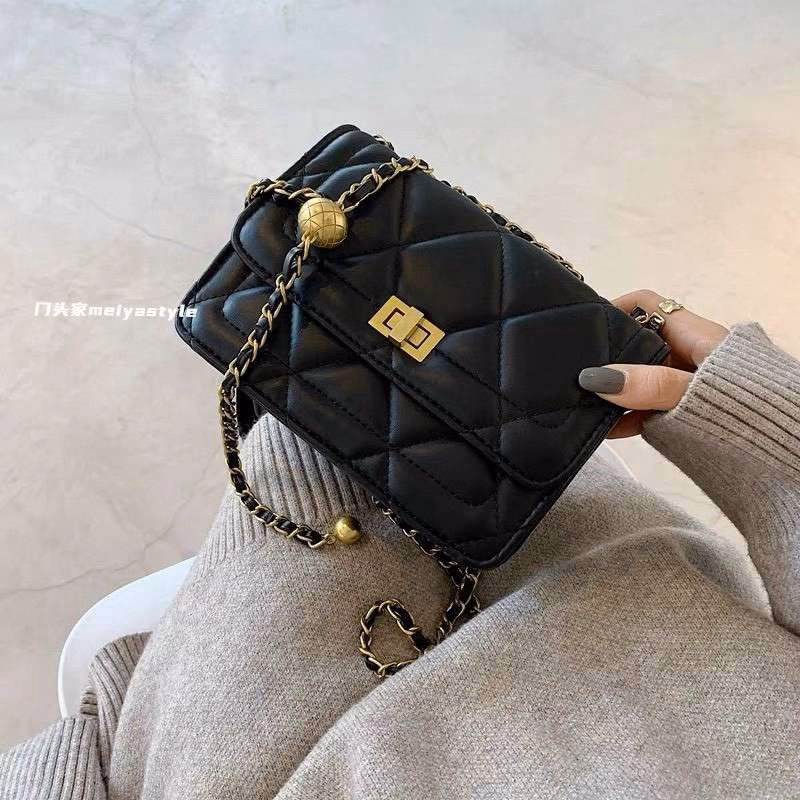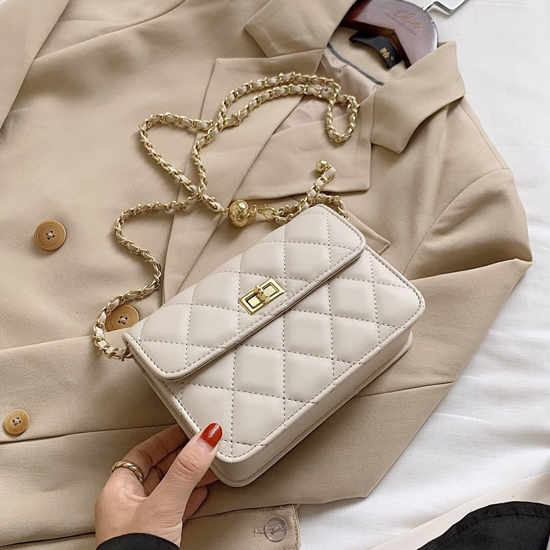 Túi đeo chéo nữ với họa tiết kẻ vuông caro ,với nắp khóa hình chữ H xoay mở chắc chắn, với thiết kế mới lạ của dây xích kết hợp với dây da còn sáng tạo thêm viên bi tròn trên dây mang đến chúng ta 1 làn gió mới về chiếc túi xách.