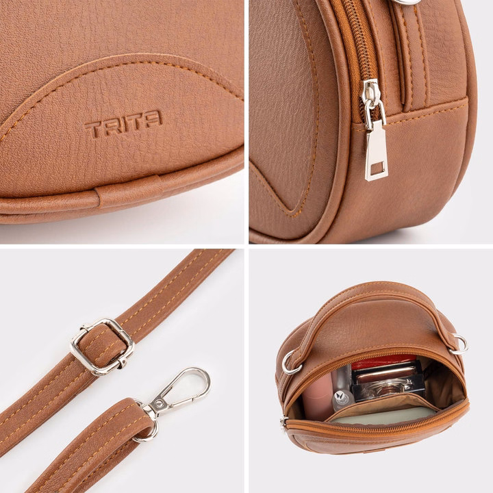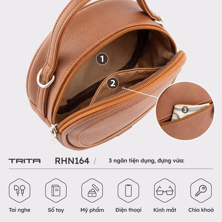 Túi đeo vai cao cấp Trita Rhn164 gây ấn tượng mạnh với form tròn lạ mắt, kết hợp kiểu đeo đa dạng như đeo chéo, đeo vai, xách tay đều rất thời thượng và tiện lợi. Túi có thể đựng vừa ví tiền mini, điện thoại và mỹ phẩm như son, kem chống nắng, son dưỡng, … Bên cạnh chất liệu da tổng hợp chống thấm nước giúp bảo quản trang bị bên trong tốt hơn thì việc thiết kế ngăn phụ ở mặt sau túi còn giúp người dùng cất giữ hoặc lấy đồ đạc được nhanh chóng và dễ dàng hơn.