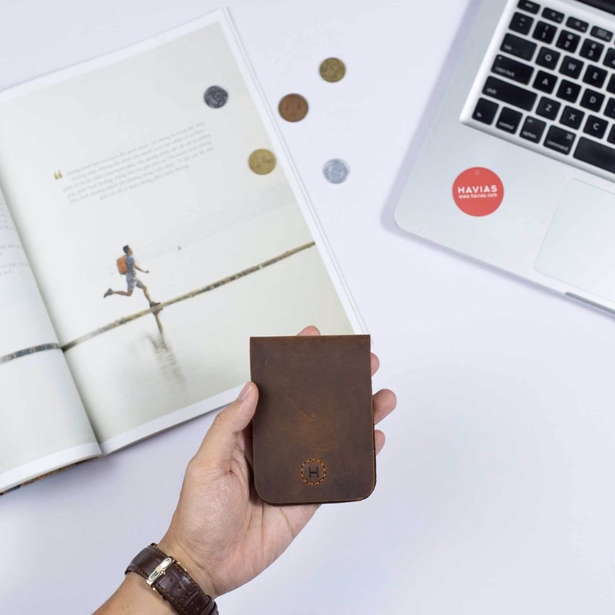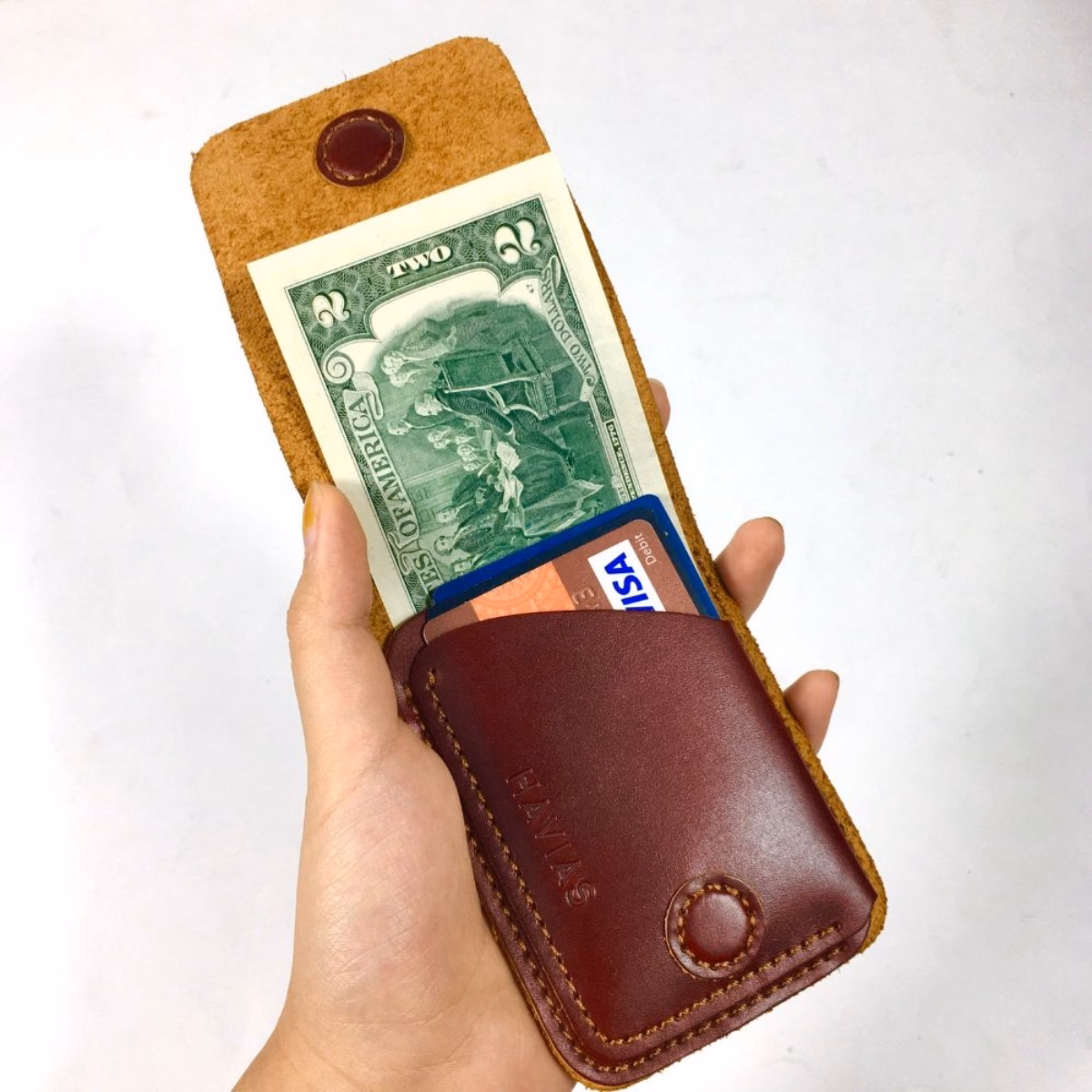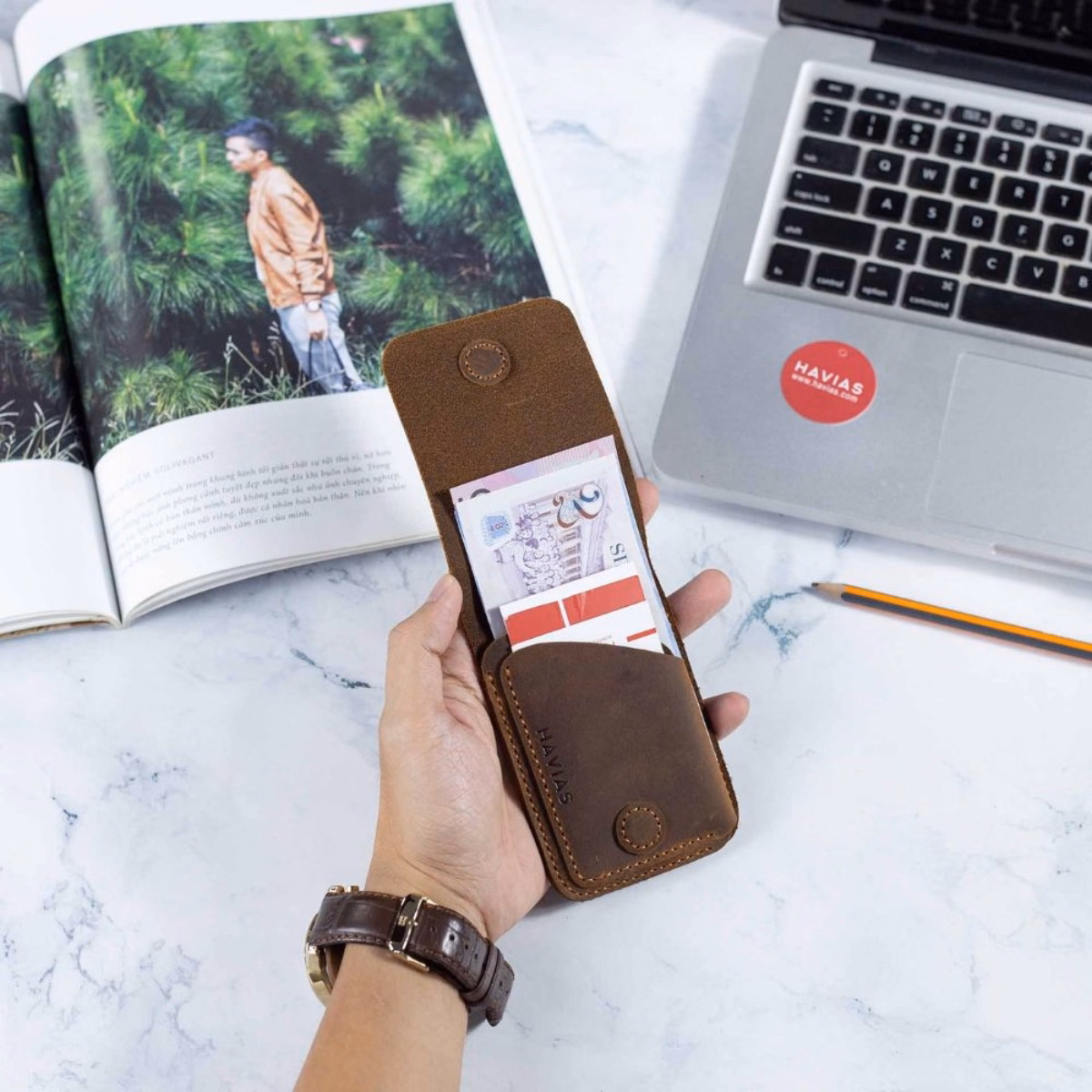 Mẫu ví đứng nắp gập tích hợp nam châm nằm trong bộ sưu tập Gerbera Wallet của Havias, sử dụng dòng da Shell Cordovan (Đen, xanh Navy, đỏ, nâu sẫm) và da bò sáp (nâu) nhập khẩu 100% có khả năng trày tương tự như da động vật.