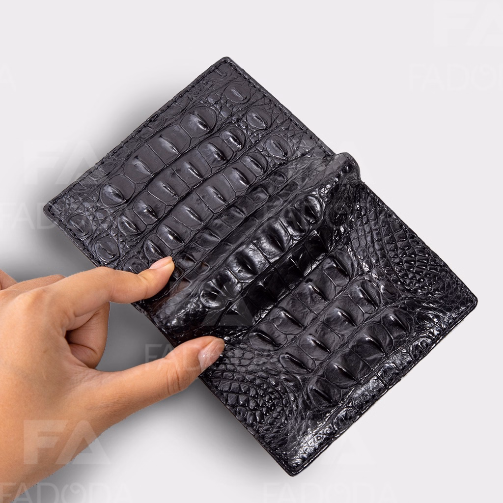 Ví đứng da cá sấu thật Fadoda cao cấp màu đen làm từ phần gai lưng cá sấu nguyên con – Fcw01l. Đây là sản phẩm của thương hiệu trực tiếp sản xuất chuyên về Da Cá Sấu Fadoda.