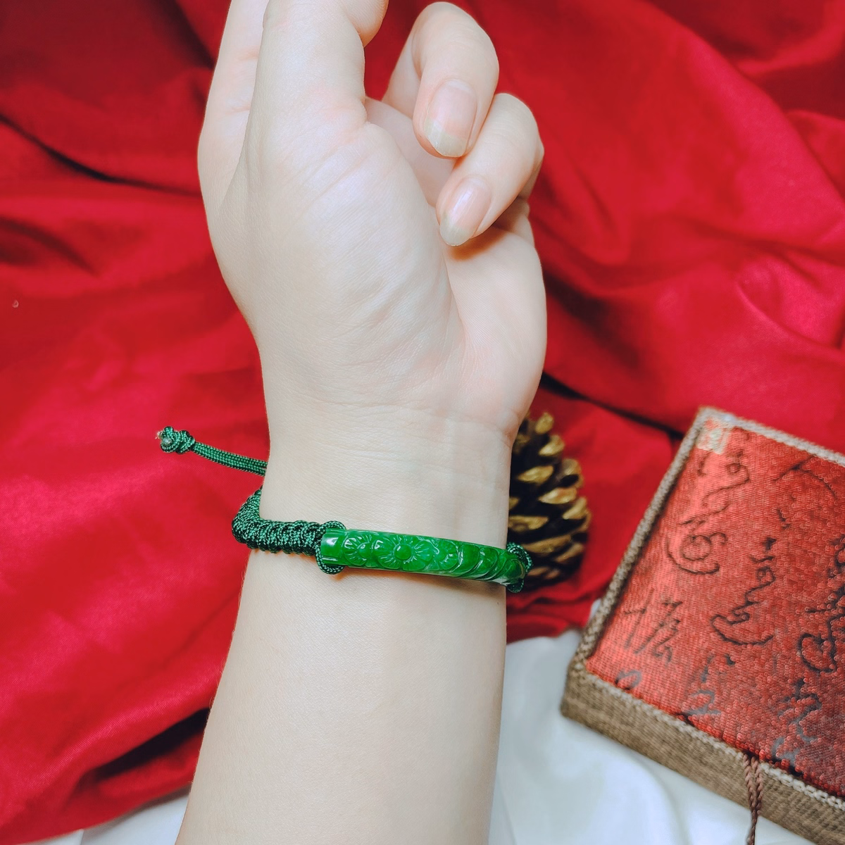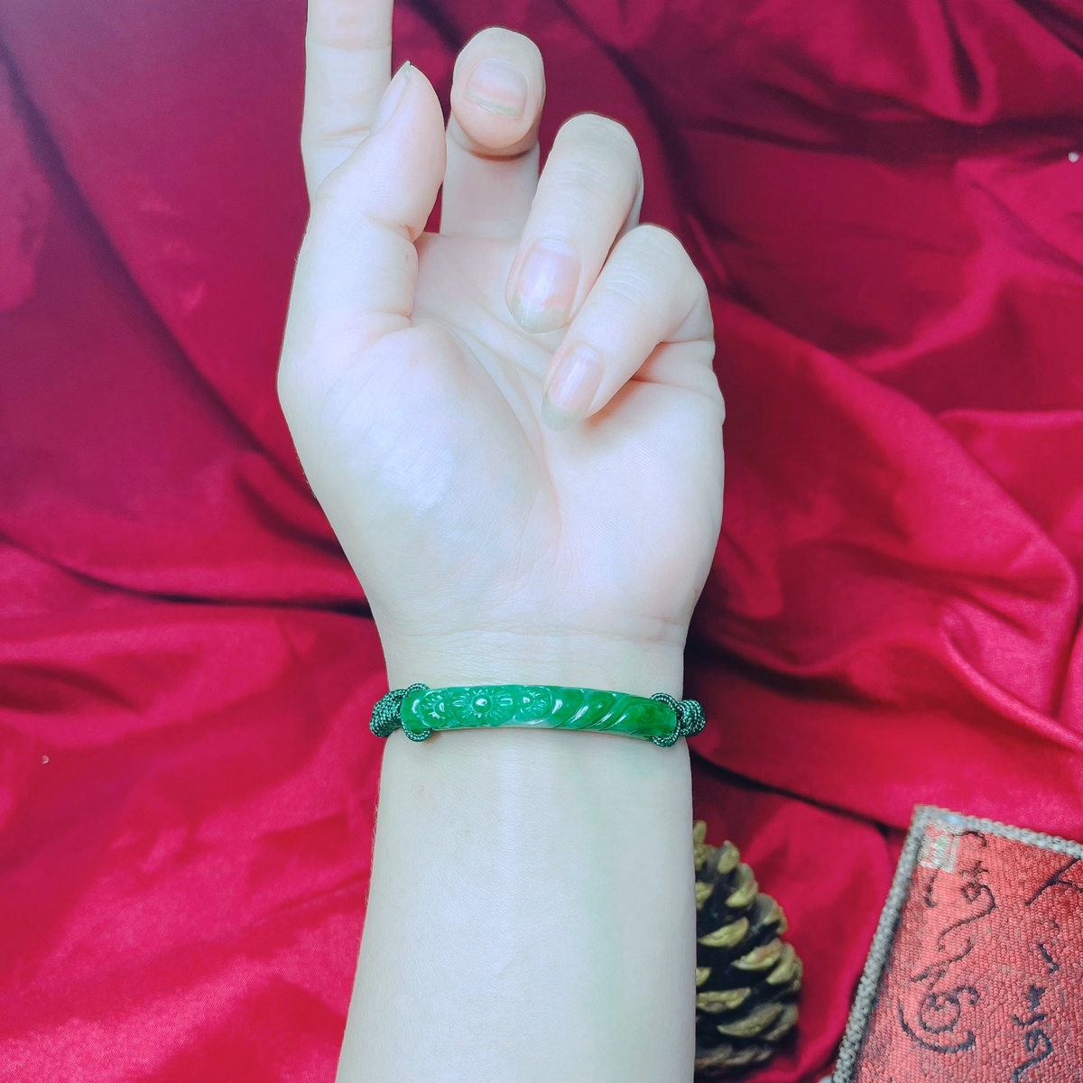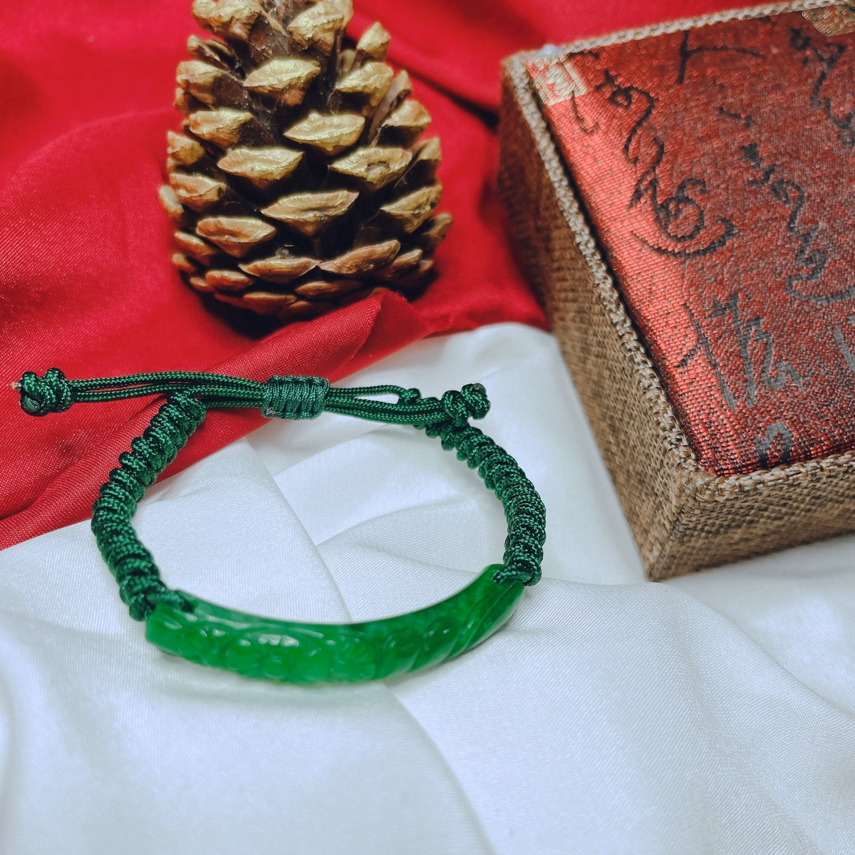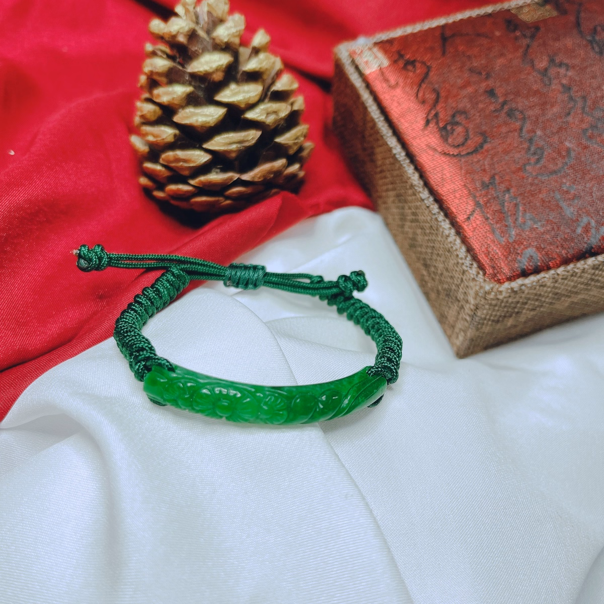 Vòng Tay Cẩm Thạch Khắc Thiên Nhiên Tết Dây Chỉ Xanh – Thắng Giang