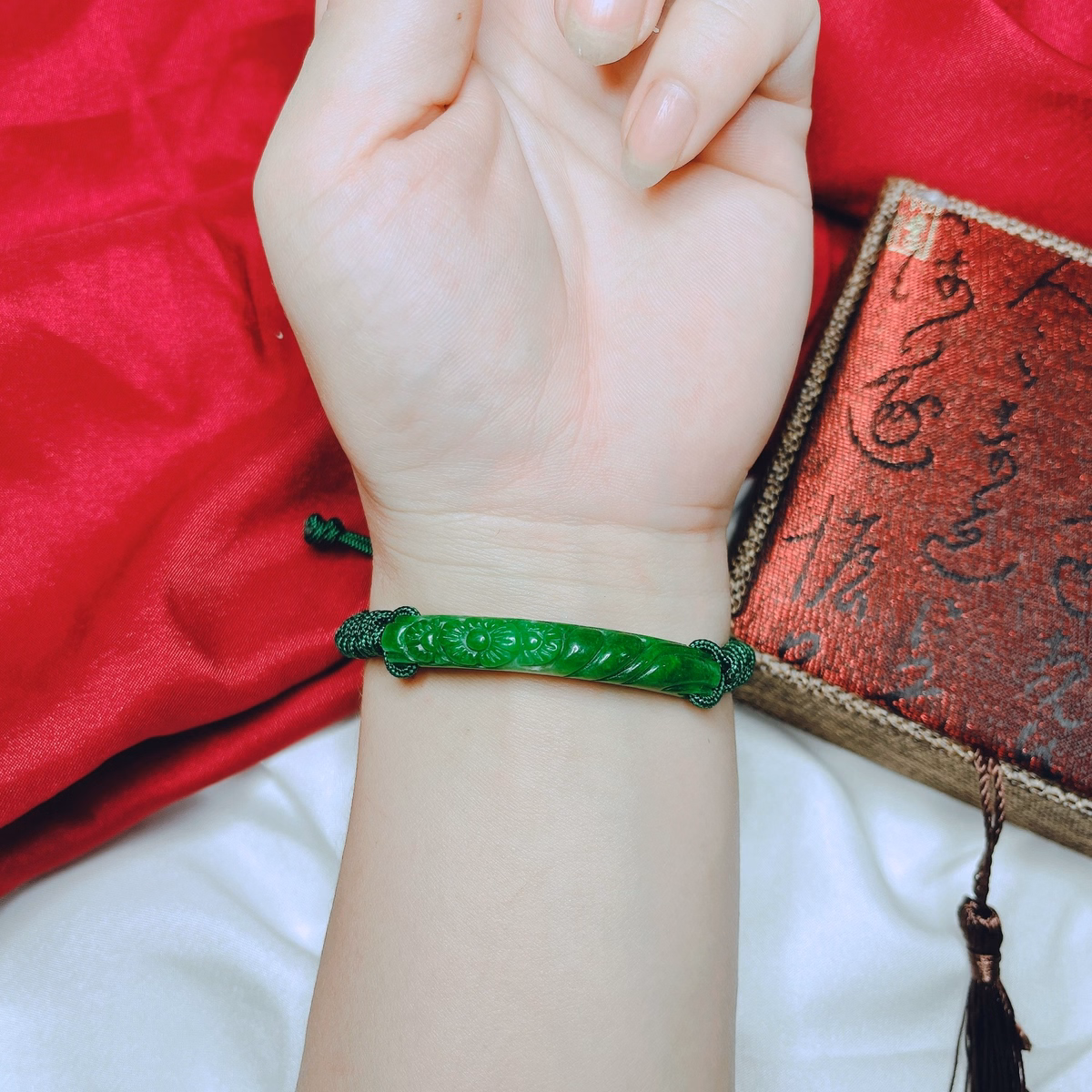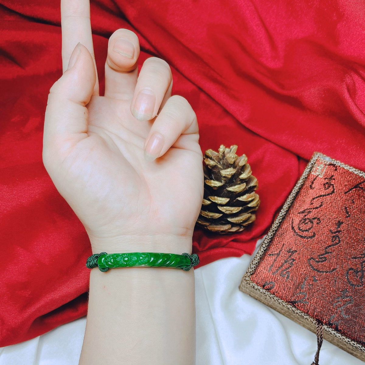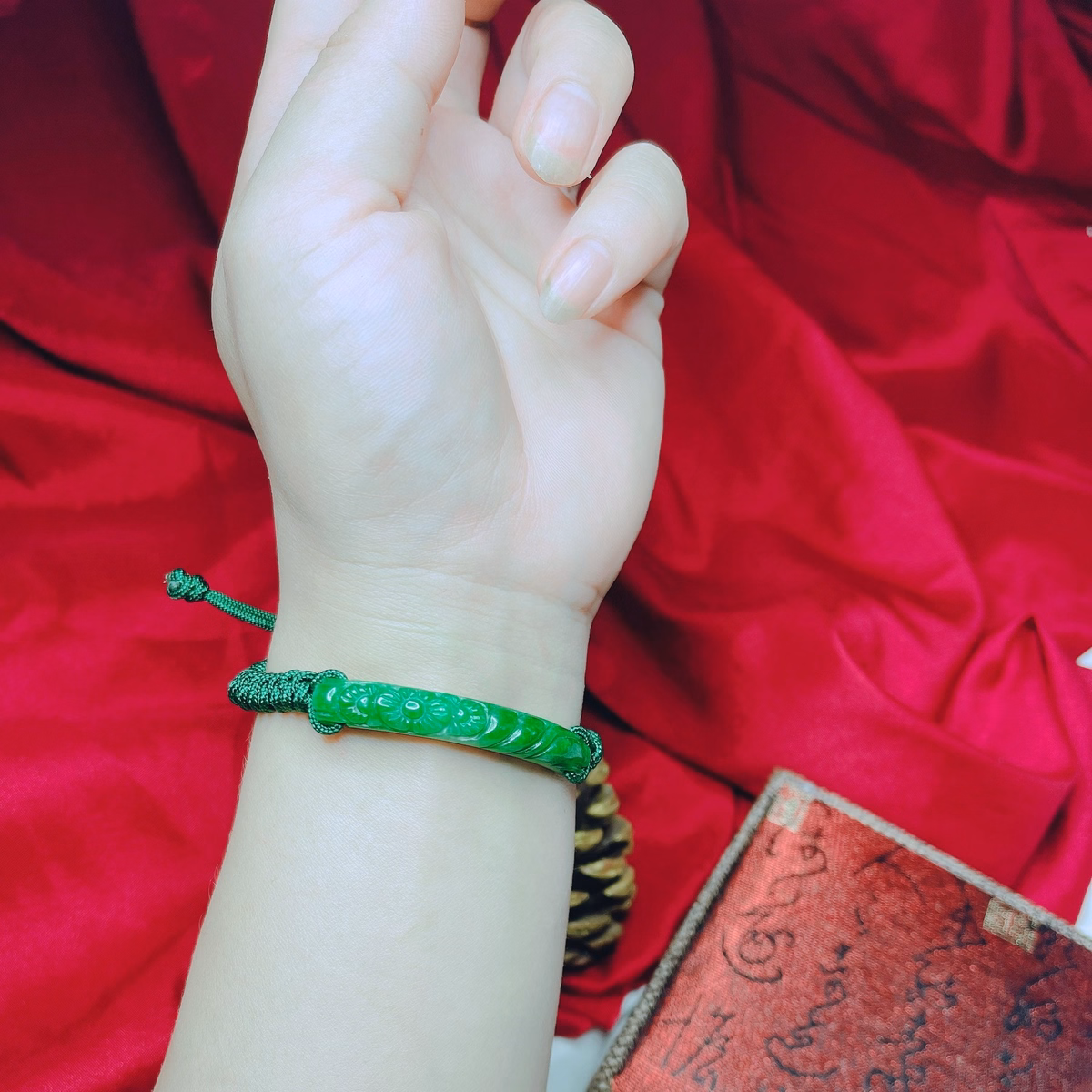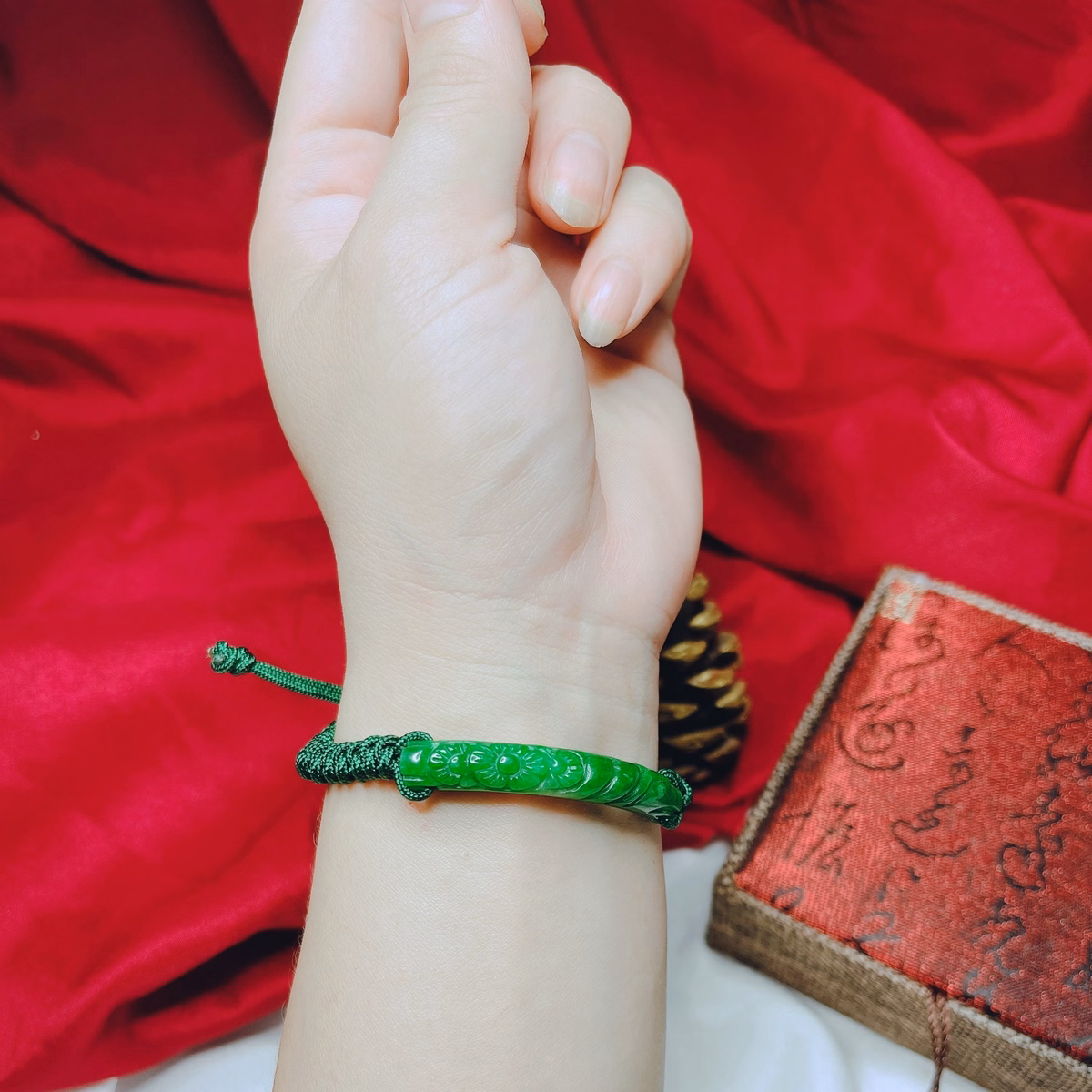 Vòng Tay Cẩm Thạch Khắc Thiên Nhiên Tết Dây Chỉ Xanh – Thắng Giang
