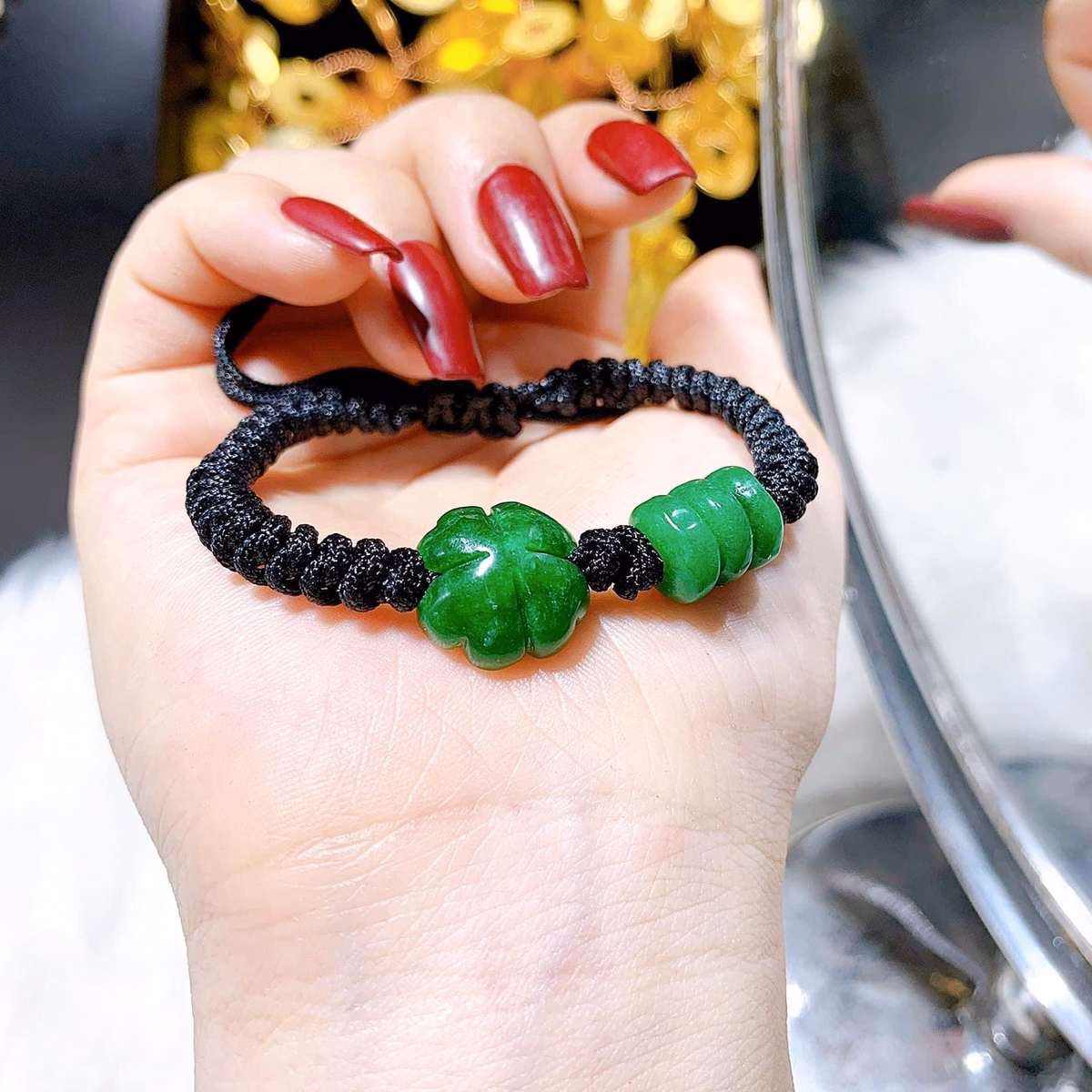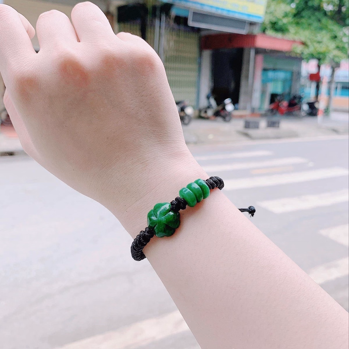 Tên sản phẩm: vòng tay cỏ bốn lá tam điếu ngọc cẩm thạch tết dây đen – thắng giang