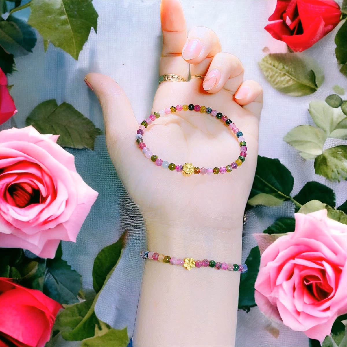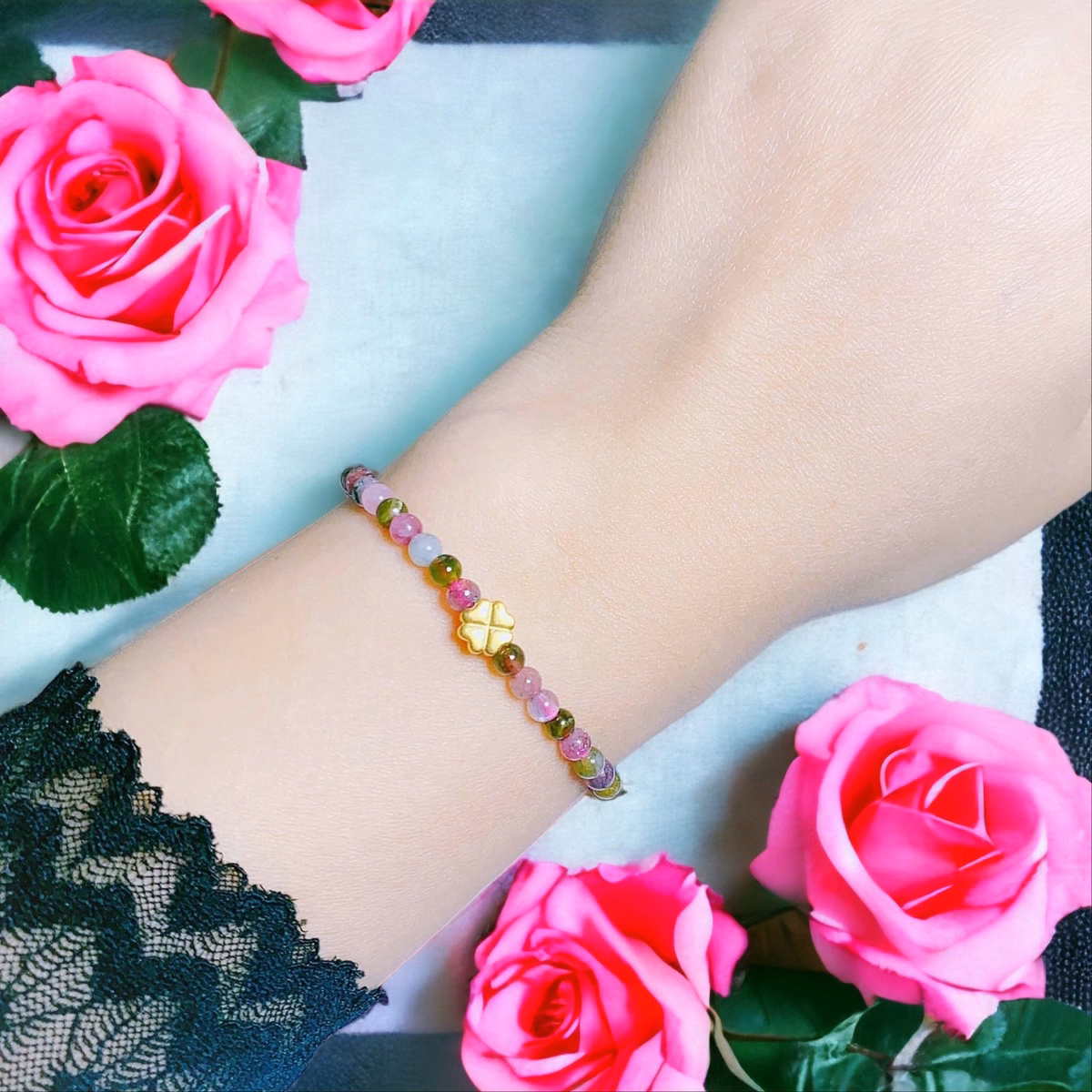 Vòng Tay Đá Tourmaline Thiên Nhiên Phối Charm Cỏ Bốn Lá Có Thẻ Hóa Đơn – Thắng Giang