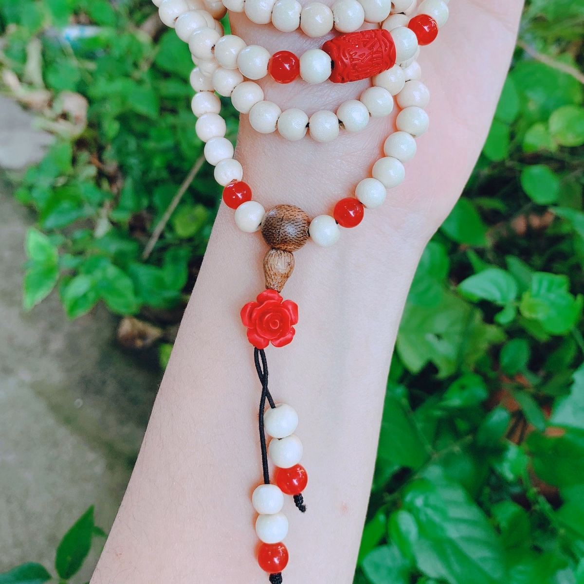 Tên sản phẩm: vòng tay dâu tằm thiên nhiên phối lu thống hoa mẫu đơn chu sa – thắng giang
