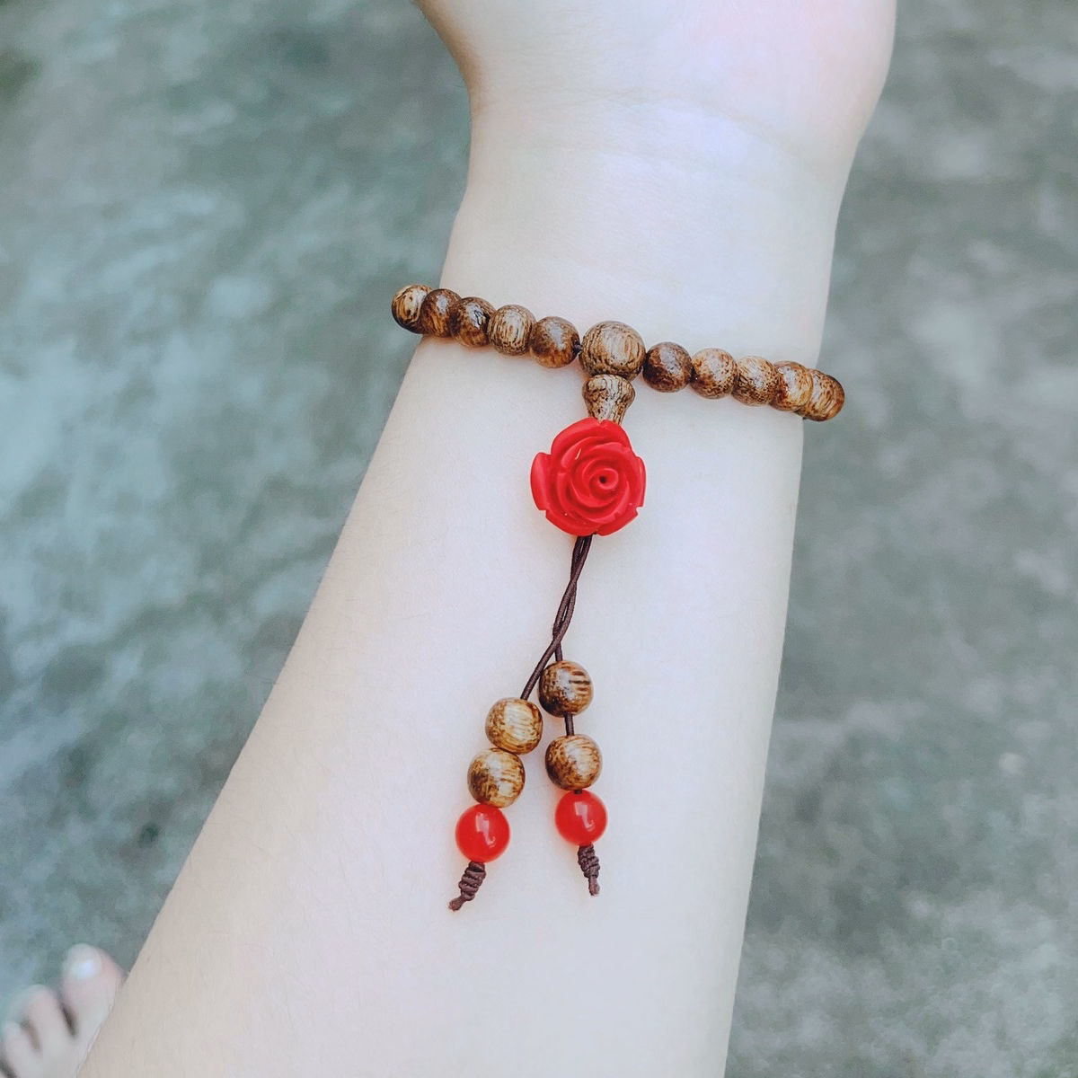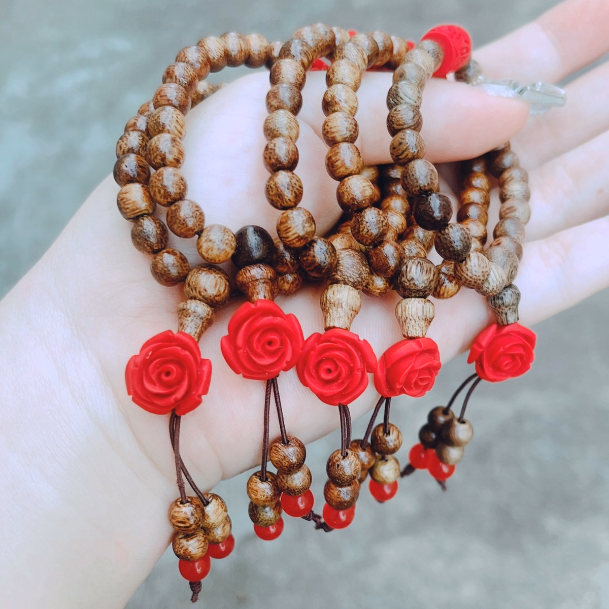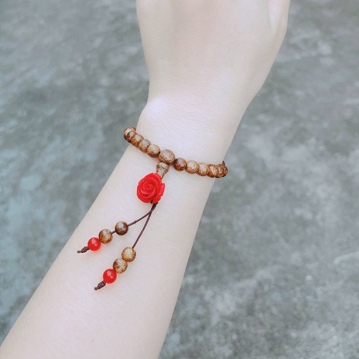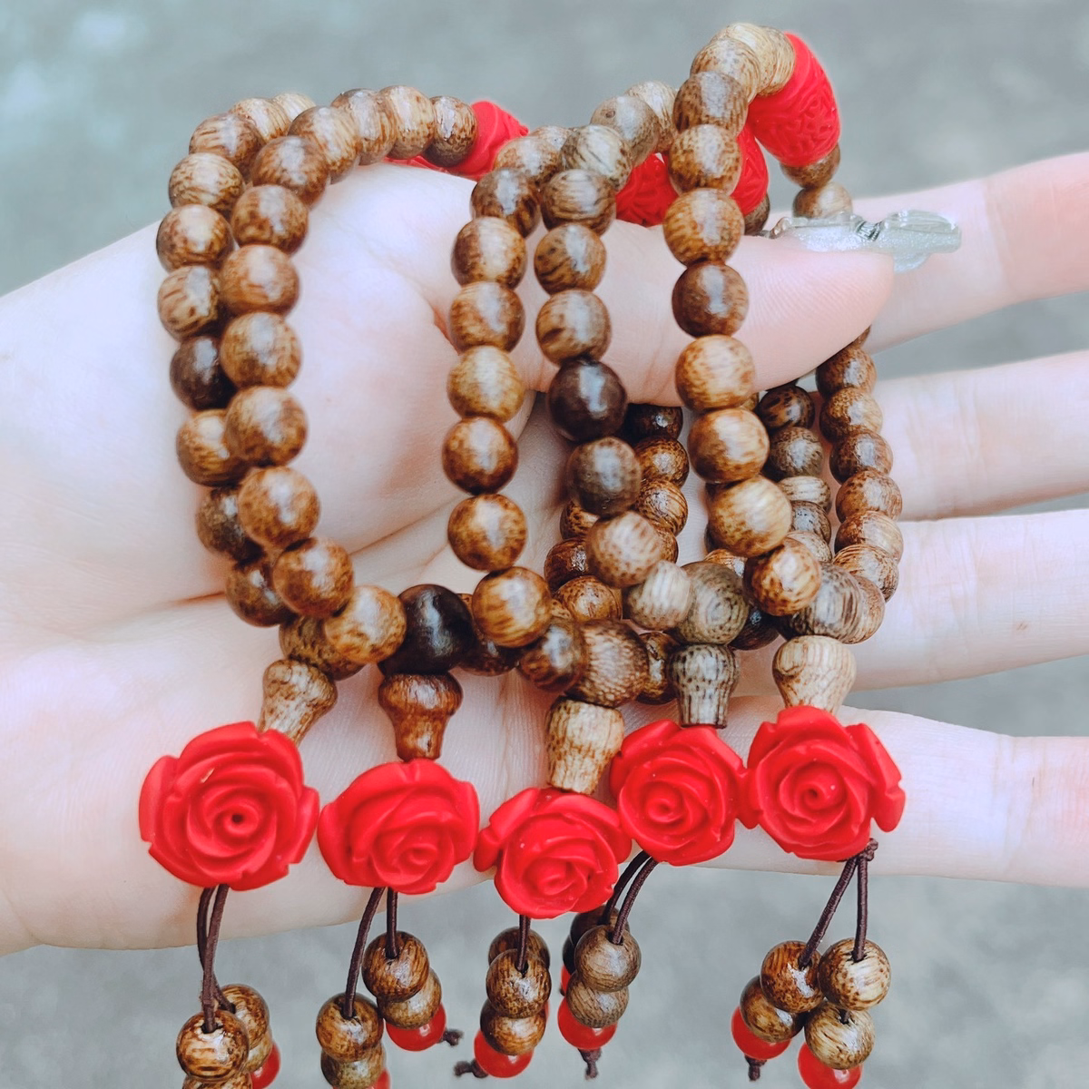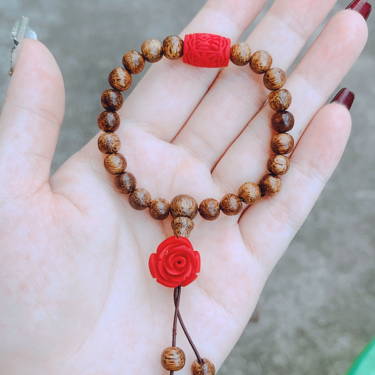 Tên sản phẩm: vòng tay đơn lu thống hoa mẫu đơn chu sa phối trầm hương – thắng giang
