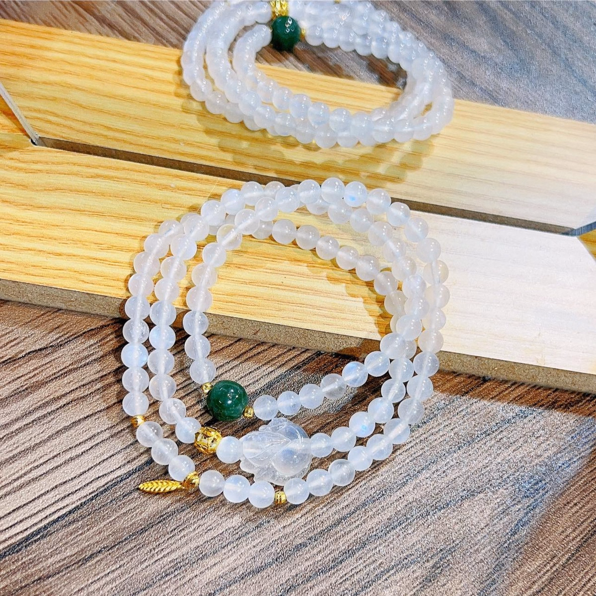Tên sản phẩm: vòng tay hồ ly đá moonstone mặt trăng charm vàng – thắng giang
