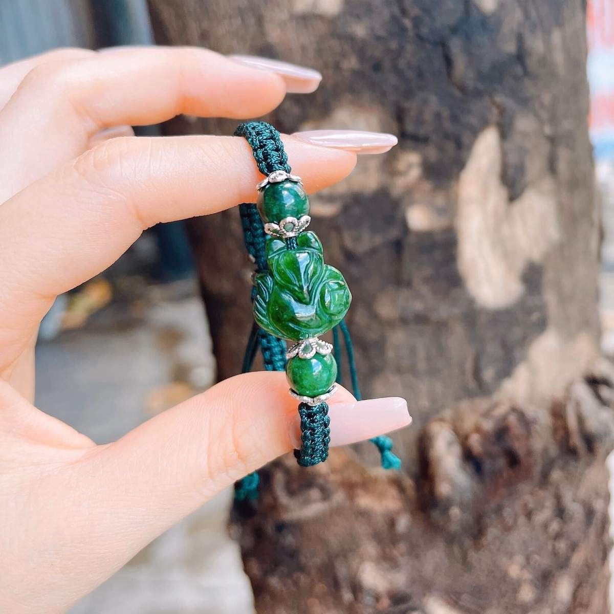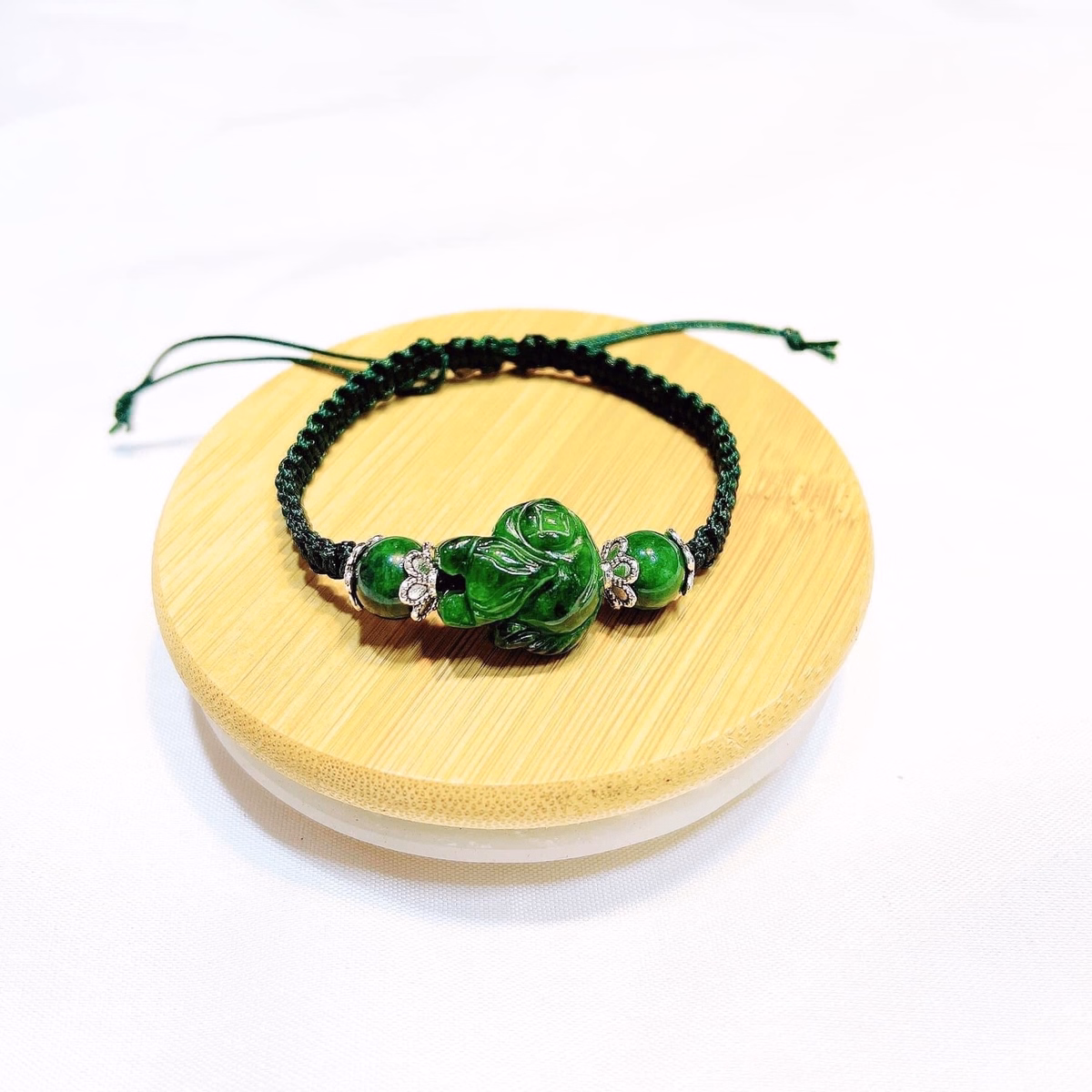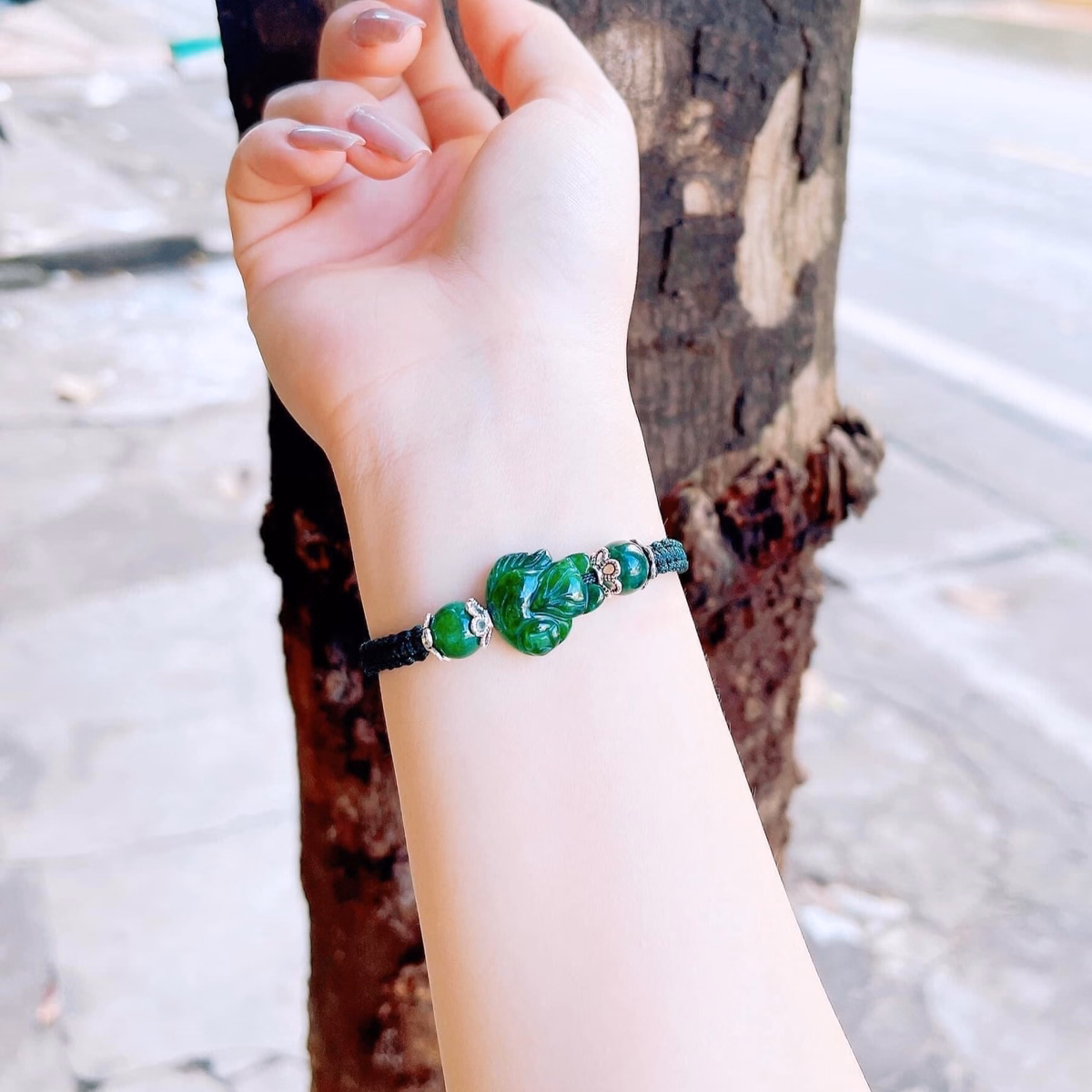 Vòng Tay Hồ Ly Ngọc Cẩm Thạch Sơn Thủy Ốp Bạc Ta Tết Dây – Thắng Giang
