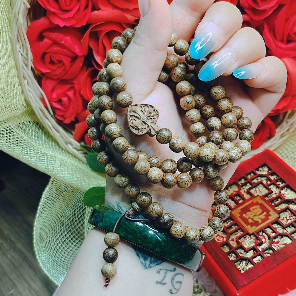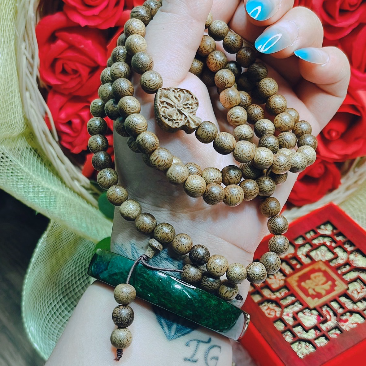 Tên sản phẩm: vòng tay nam trầm hương tốc thiên nhiên phối lá bồ đề – thắng giang