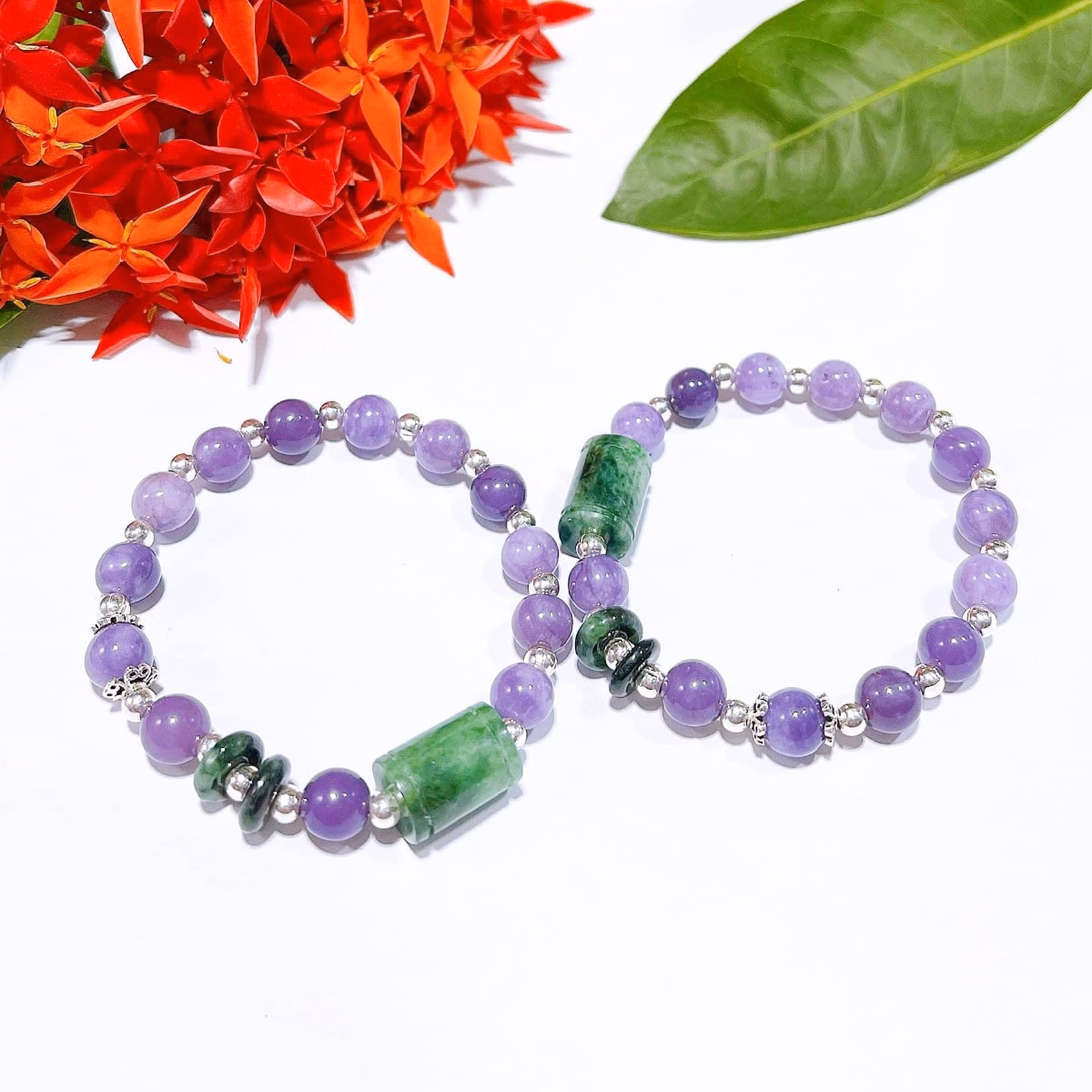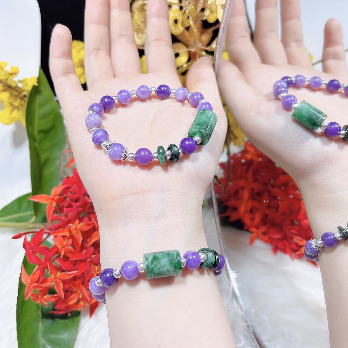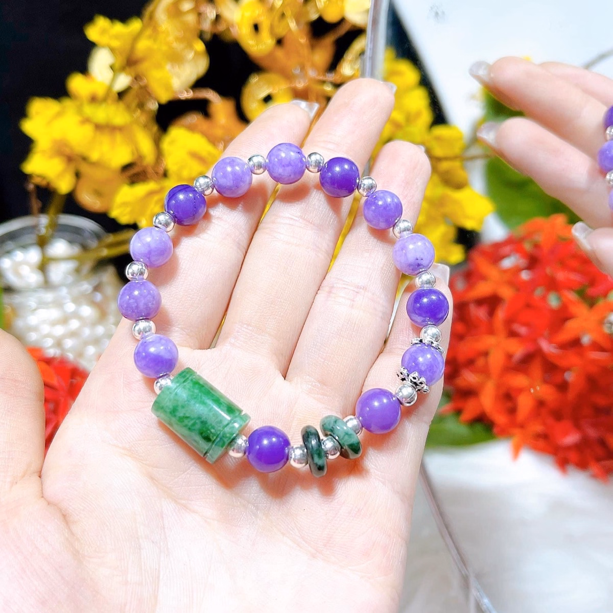 Vòng Tay Thạch Anh Tím Phối Lu Thống Song Điếu Ngọc Cẩm Thạch Sơn Thủy Thiên Nhiên Phụ Kiện Chuẩn Bạc Ta – Thắng Giang