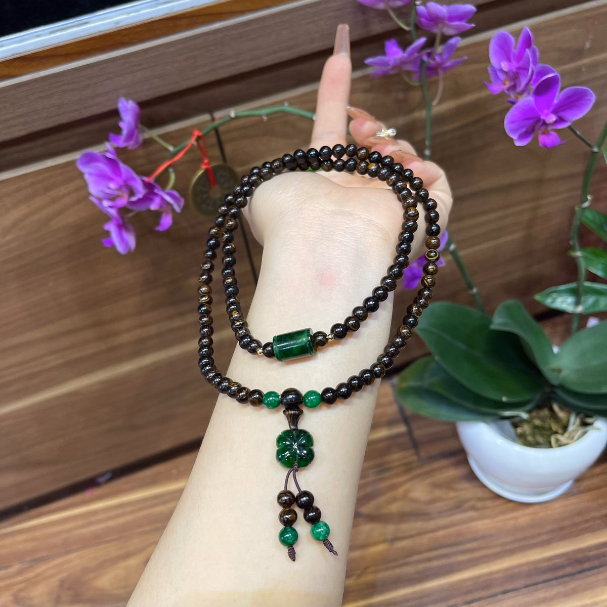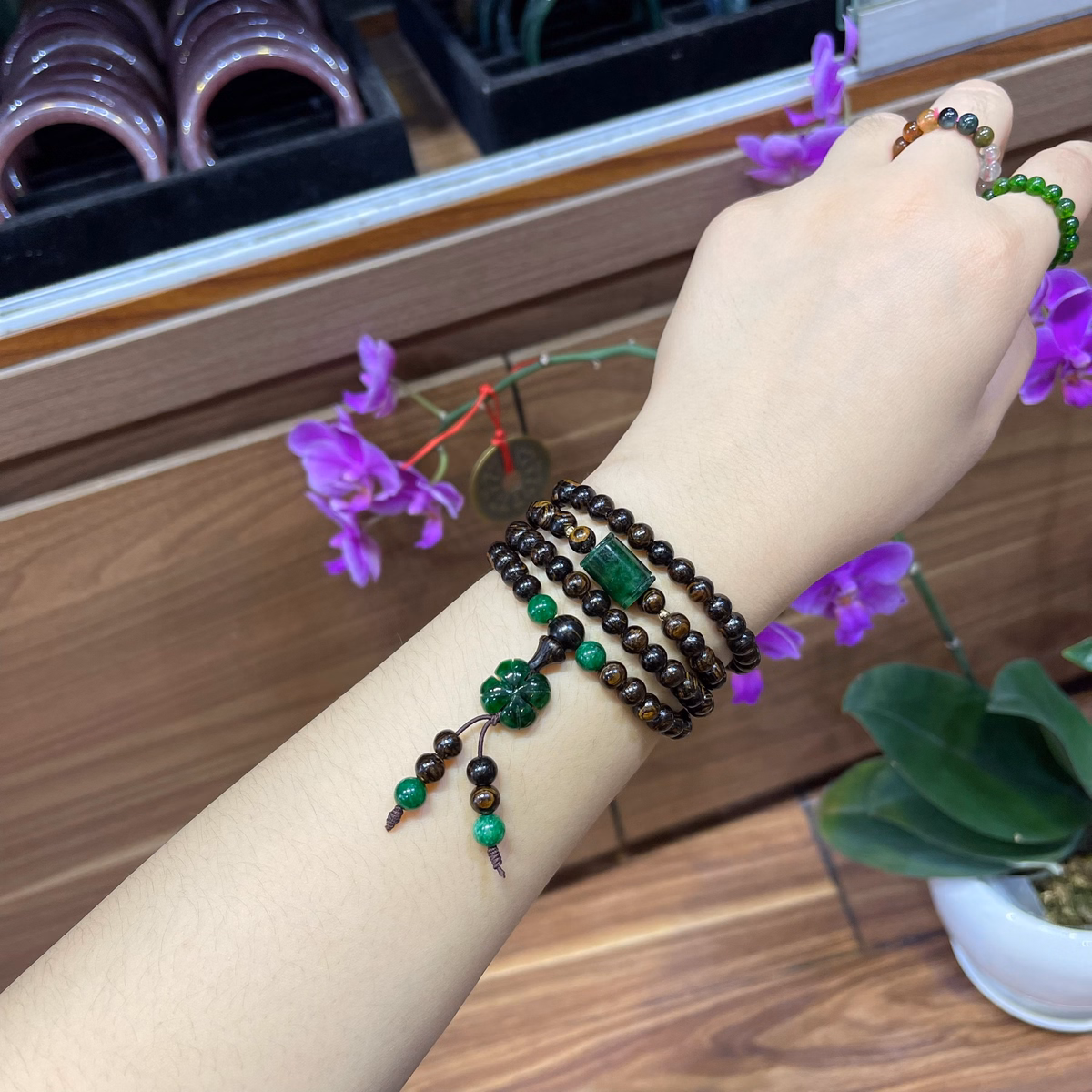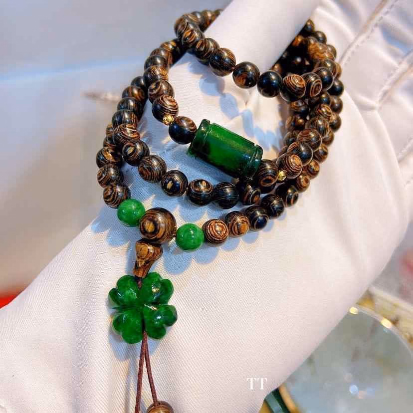 Vòng Tay Trầm Hương Sánh Chìm Phối Lu Thống Cỏ 4 Lá May Mắn Ngọc Cẩm Thạch Sơn Thuỷ Thiên Nhiên – Thắng Giang