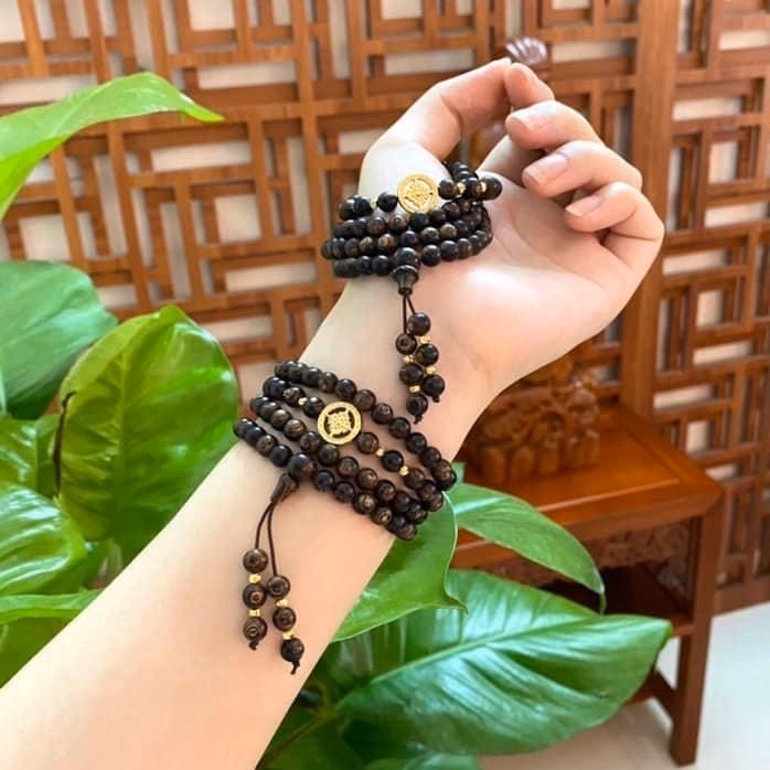 Tên sản phẩm: vòng tay trầm hương sánh chìm thiên nhiên phối bánh xe pháp luân bạc ta xi vàng 24 kara – thắng giang