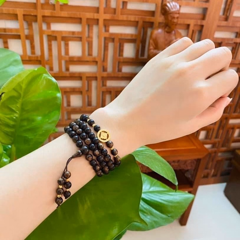 Vòng Tay Trầm Hương Sánh Chìm Thiên Nhiên Phối Bánh Xe Pháp Luân Bạc Ta Xi Vàng 24 Kara – Thắng Giang