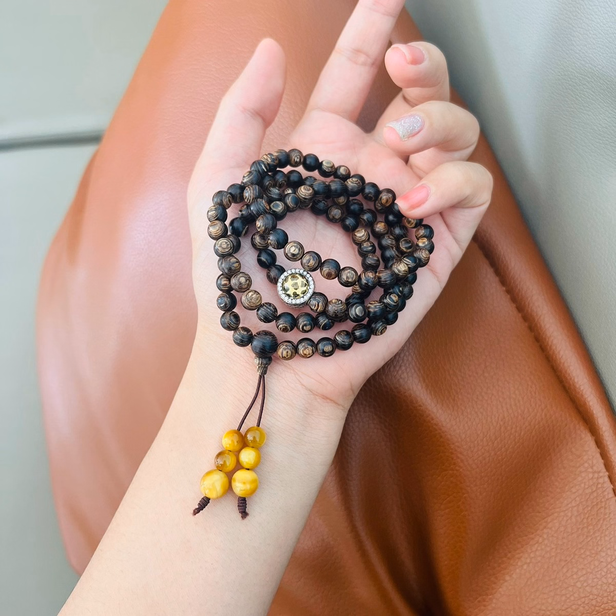 Chất liệu: Trầm hương tốc và charm bạc thái , đá thạch anh mắt hổ tâm vàng