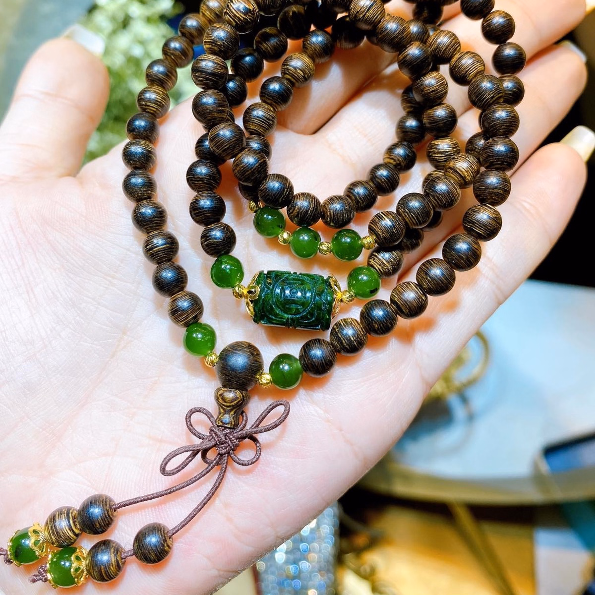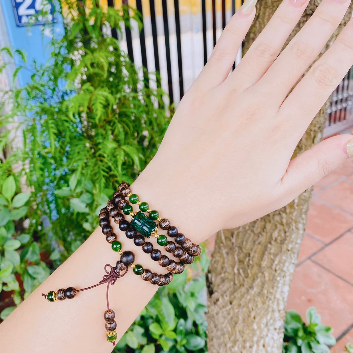 Vòng Tay Trầm Hương Sánh Thiên Nhiên Phối Lu Thống Cẩm Thạch Trạm Khắc, Phối Charm Xi Vàng – Thắng Giang