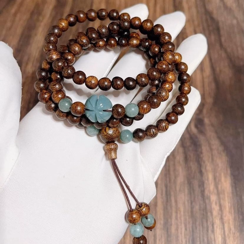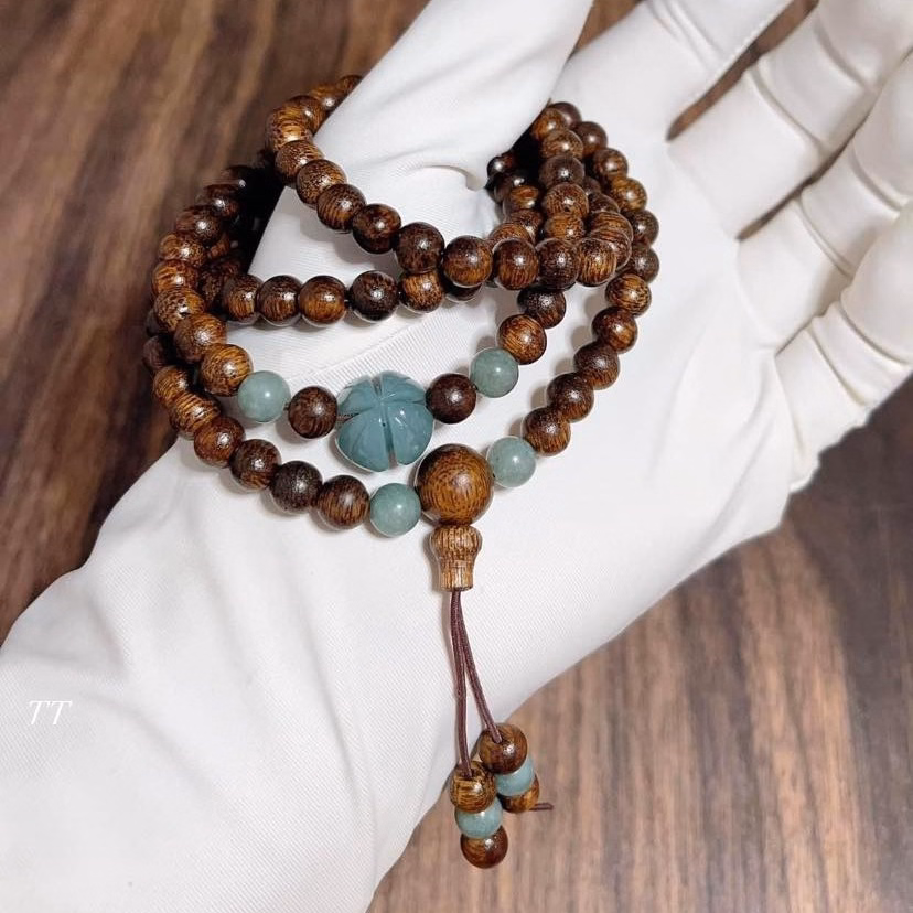 Vòng Tay Trầm Hương Tốc Thiên Nhiên Phối Cỏ Bốn Lá Lam Ngọc – Thắng Giang