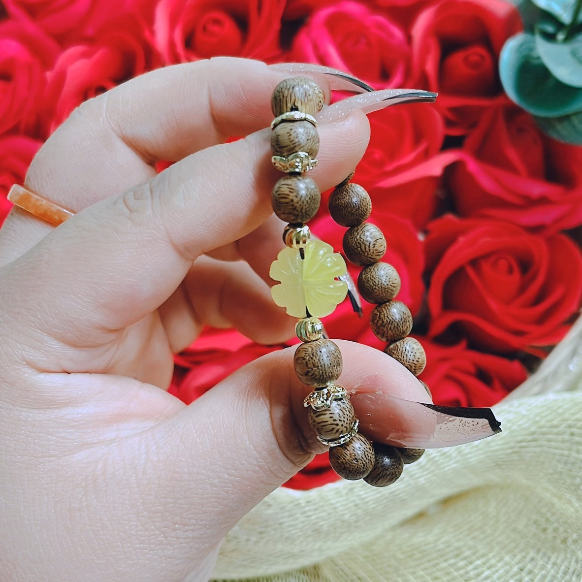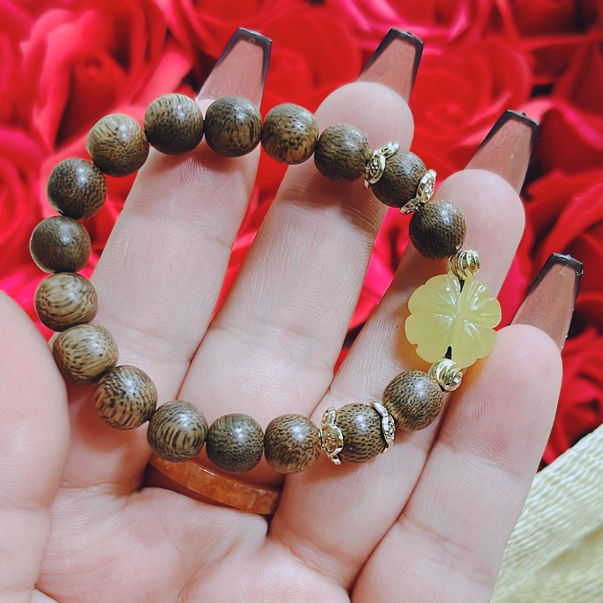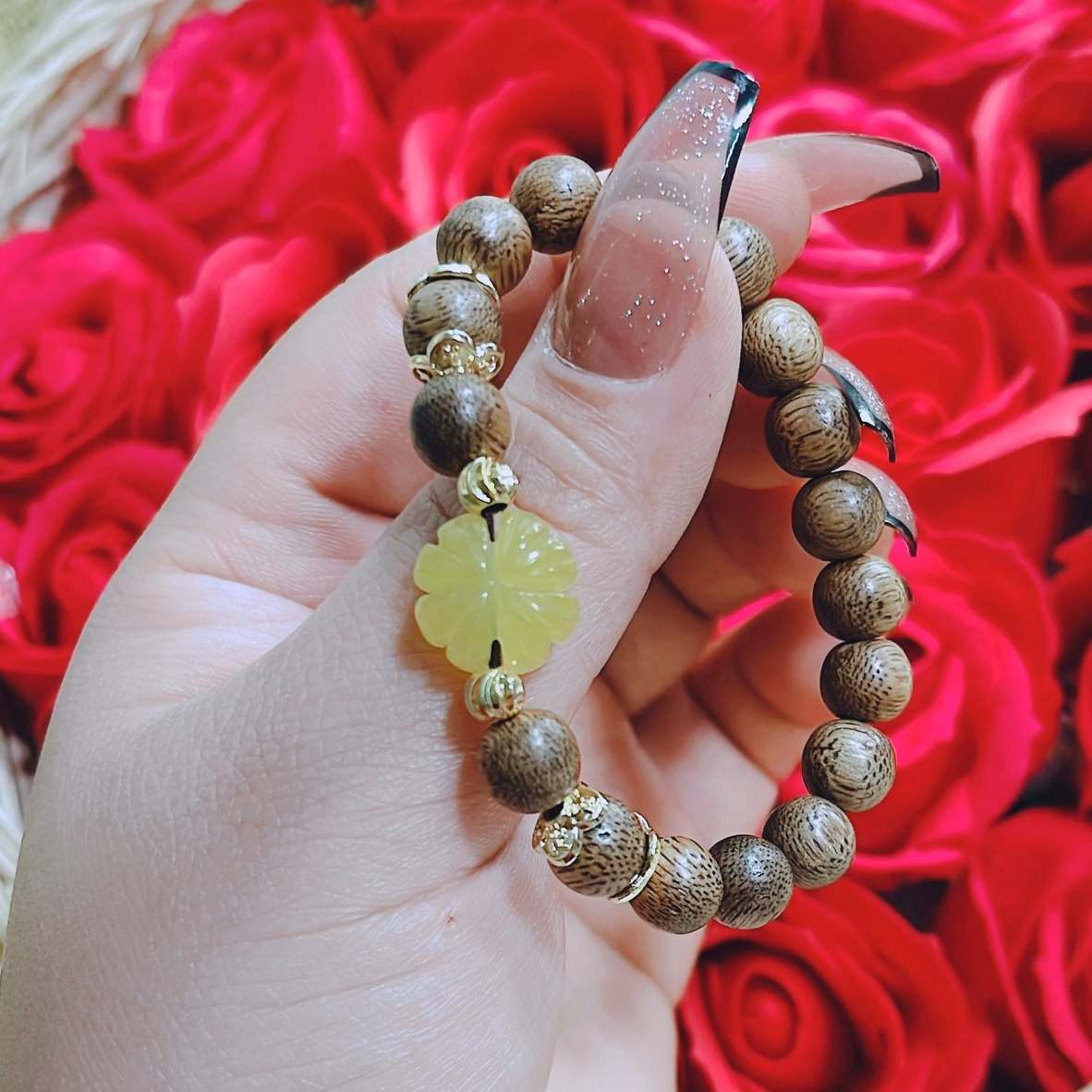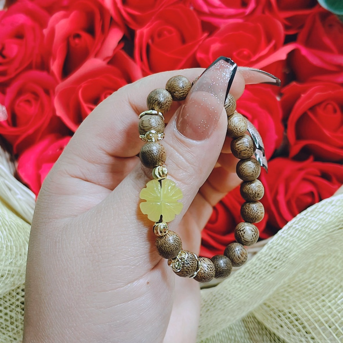 Vòng Tay Trầm Hương Tốc Thiên Nhiên Phối Cỏ Bốn Lá Ngọc Cẩm Thạch Vàng – Thắng Giang