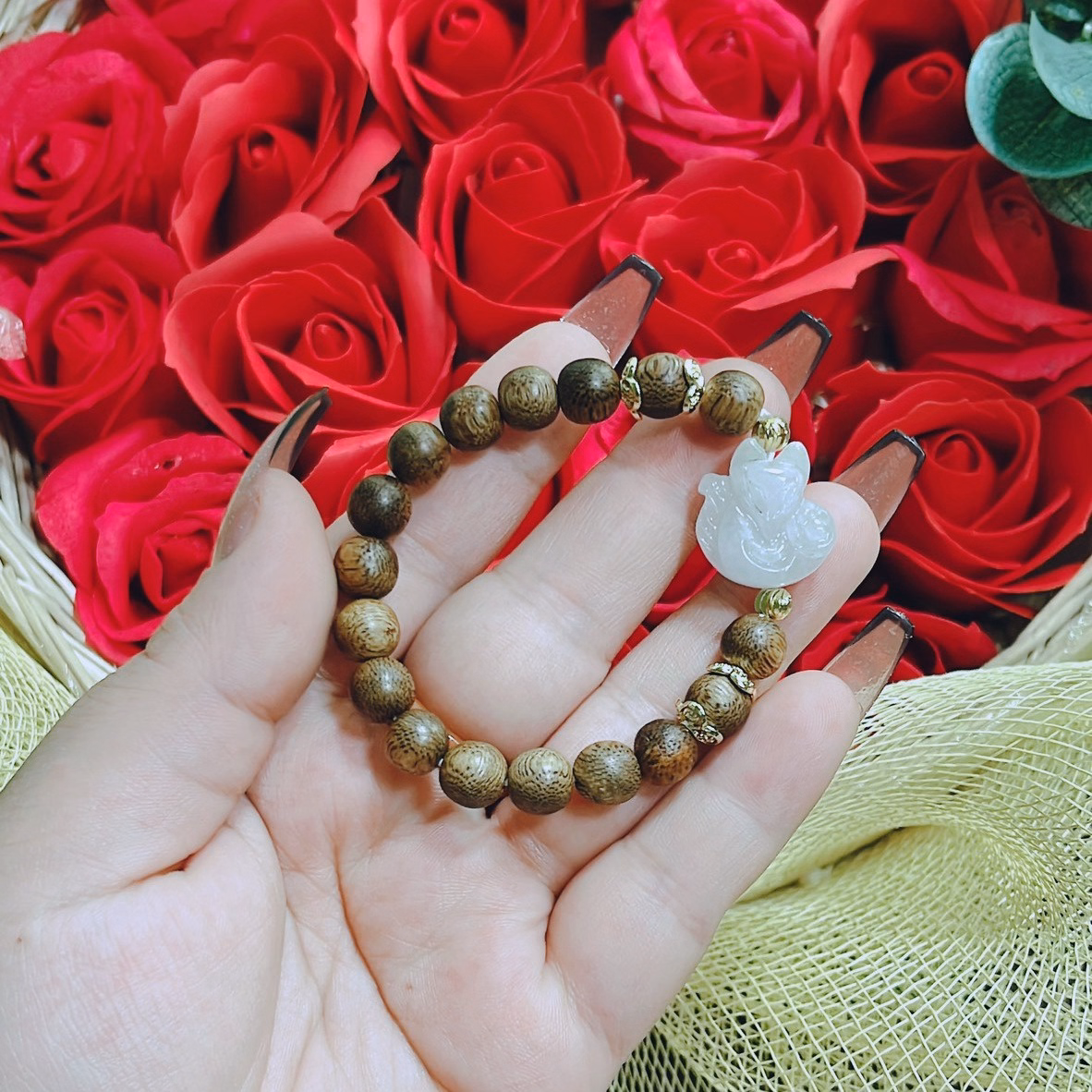 Vòng Tay Trầm Hương Tốc Thiên Nhiên Phối Hồ Ly Ngọc Cẩm Thạch Trắng Phớt – Thắng Giang