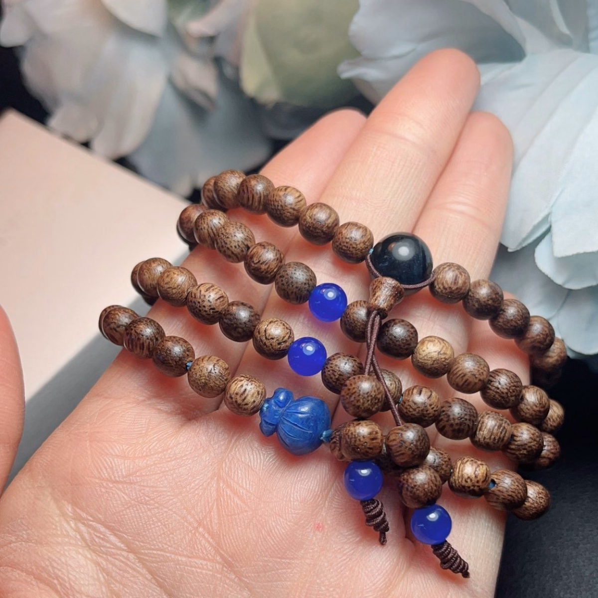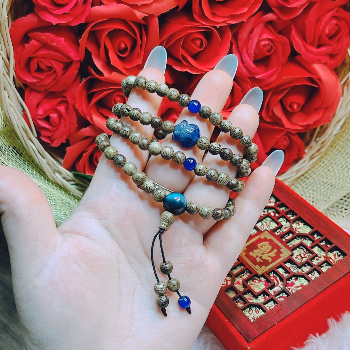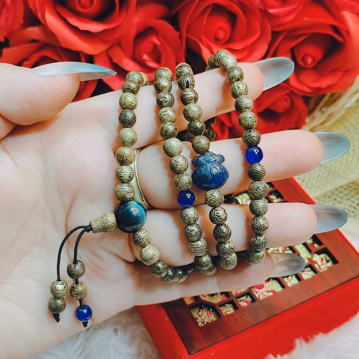 Vòng Tay Trầm Hương Tốc Thiên Nhiên Phối Túi Tiền Đá Lapiz Thiên Thanh Tụ Lộc 108 Hạt – Thắng Giang