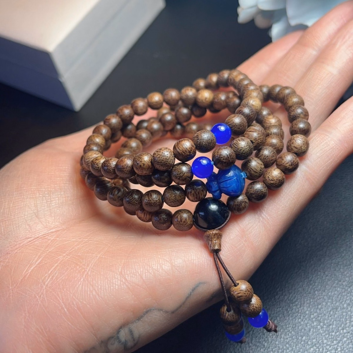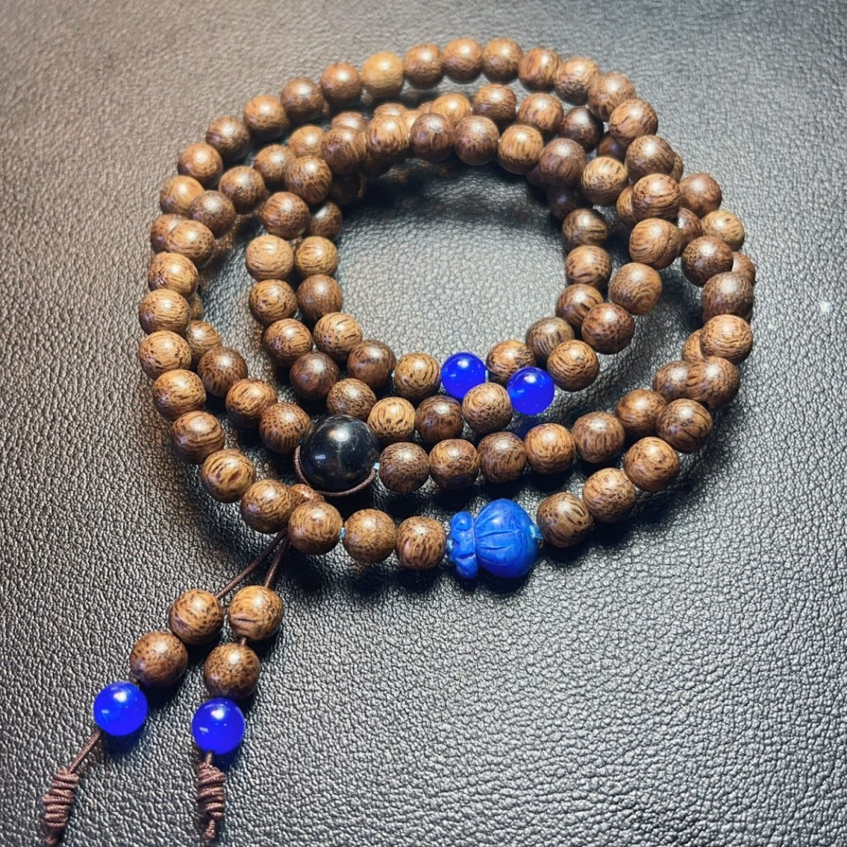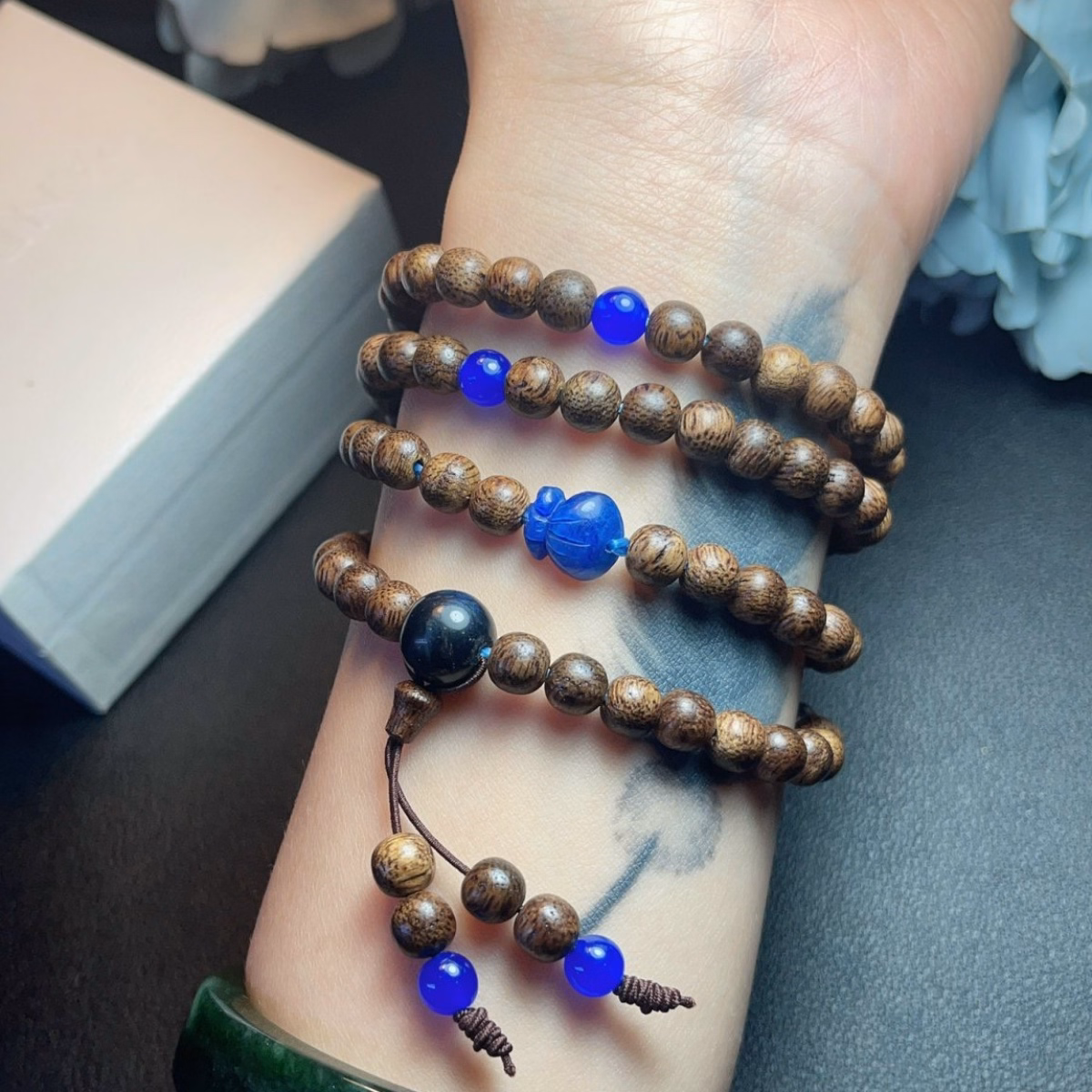 Vòng Tay Trầm Hương Tốc Thiên Nhiên Phối Túi Tiền Đá Lapiz Thiên Thanh Tụ Lộc 108 Hạt – Thắng Giang