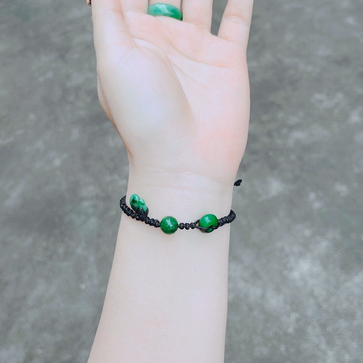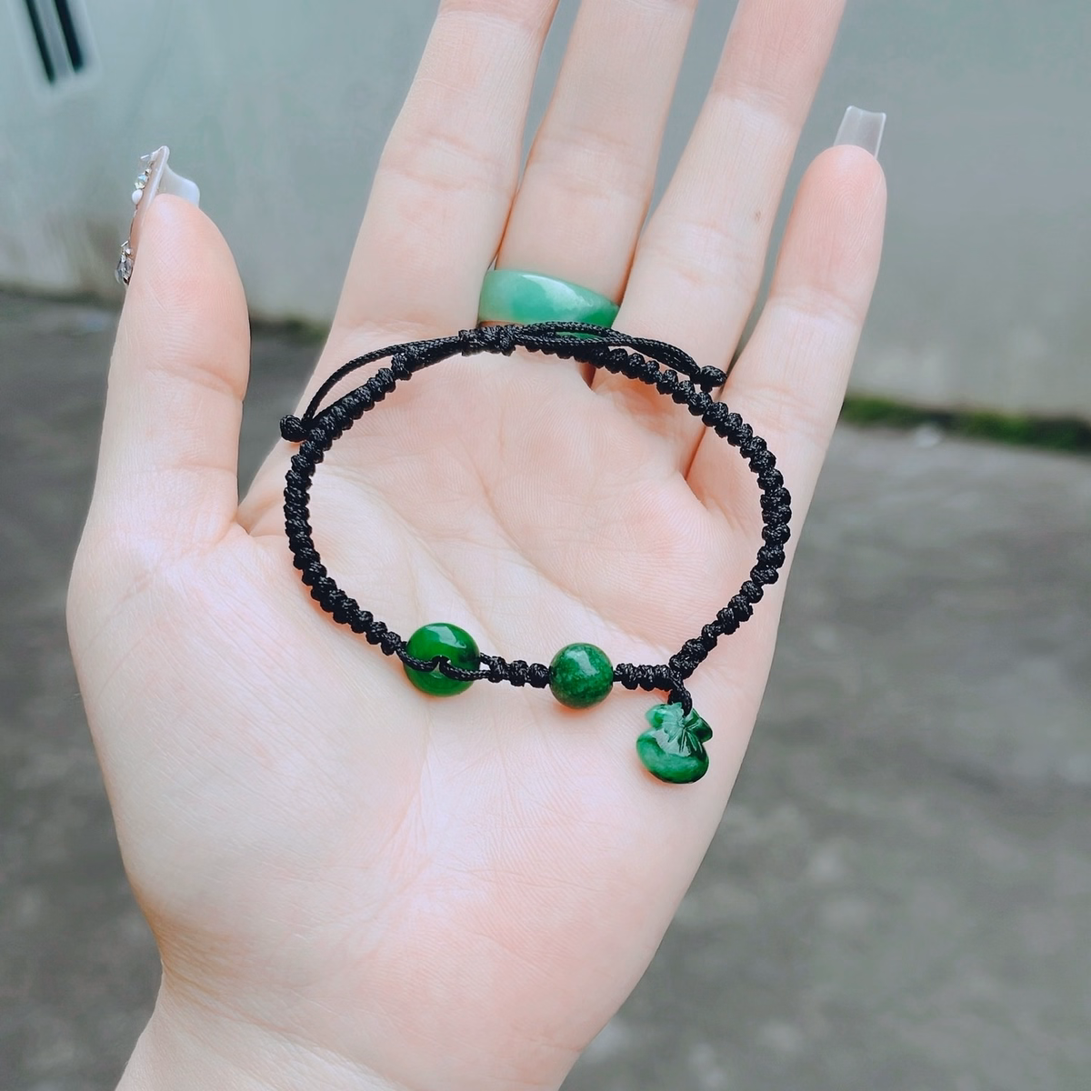 Tên sản phẩm: vòng tay túi tiền ngọc cẩm thạch sơn thủy thiên nhiên tết dây – thắng giang